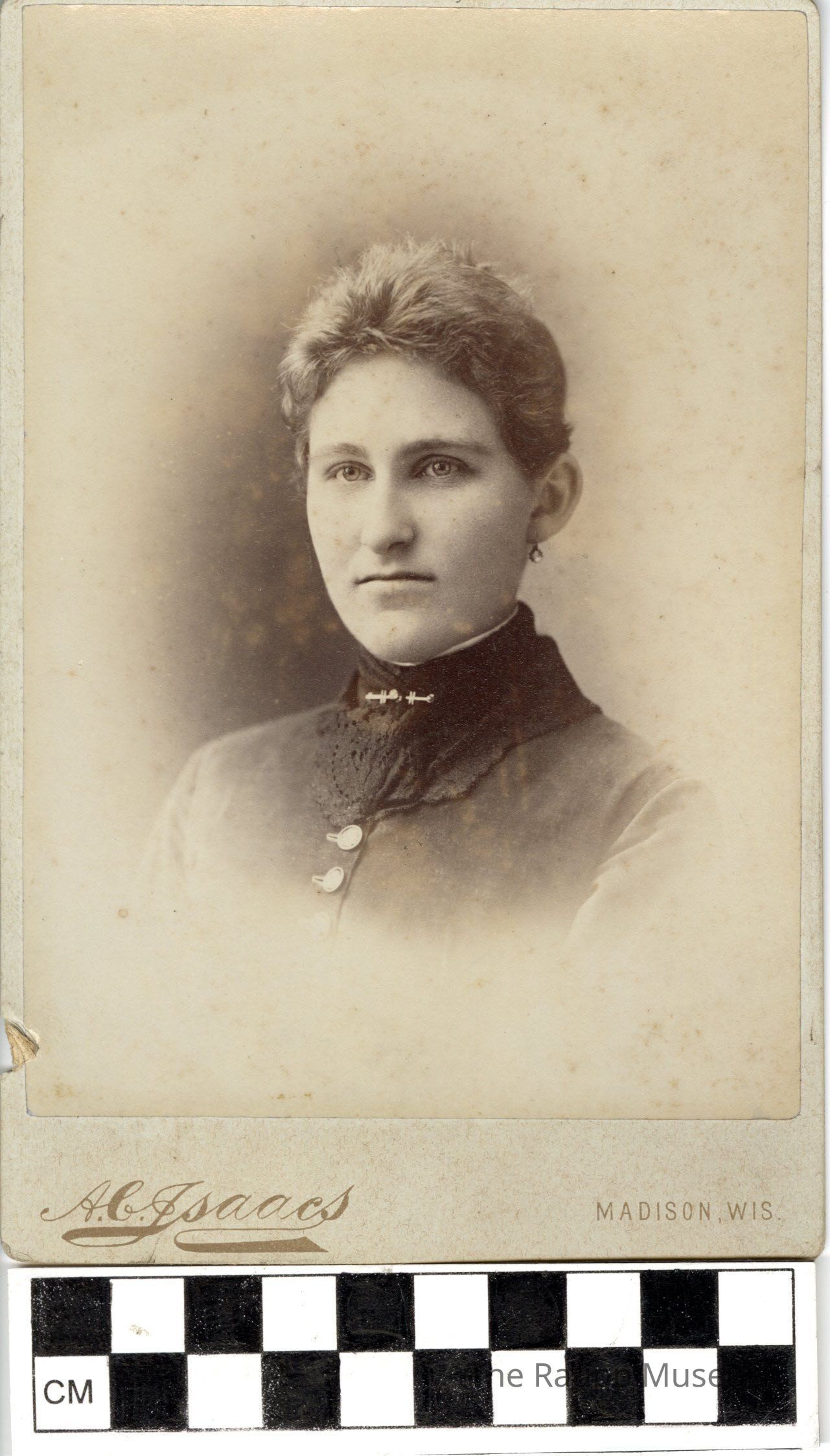 One (1) black and white sepia toned photograph of a woman from the chest and up. She is wearing a black buttoned top with white buttons and a silver clasp on the neck. She has on small round earrings. Her hair is cut short. There is a faded effect on the sides of the photo. The photo is attached to a beige mat board with "A.C. Isaacs, Madison, Wis." printed in bronze on the bottom.