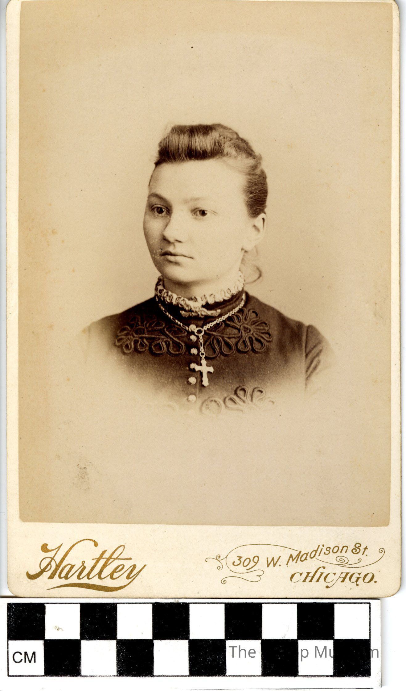 One (1) black and white sepia toned photograph of a woman from the chest and up. She is wearing a black top with leaf/wavy embossed design on the top and middle - horizontally across. She is wearing a silver cross necklace. Her head is turned to her right slightly. Her hair is pulled back. The photo is attached to a beige mat board. On the bottom is printed in gold: "Hartley, 309 W. Madison St., Chicago."