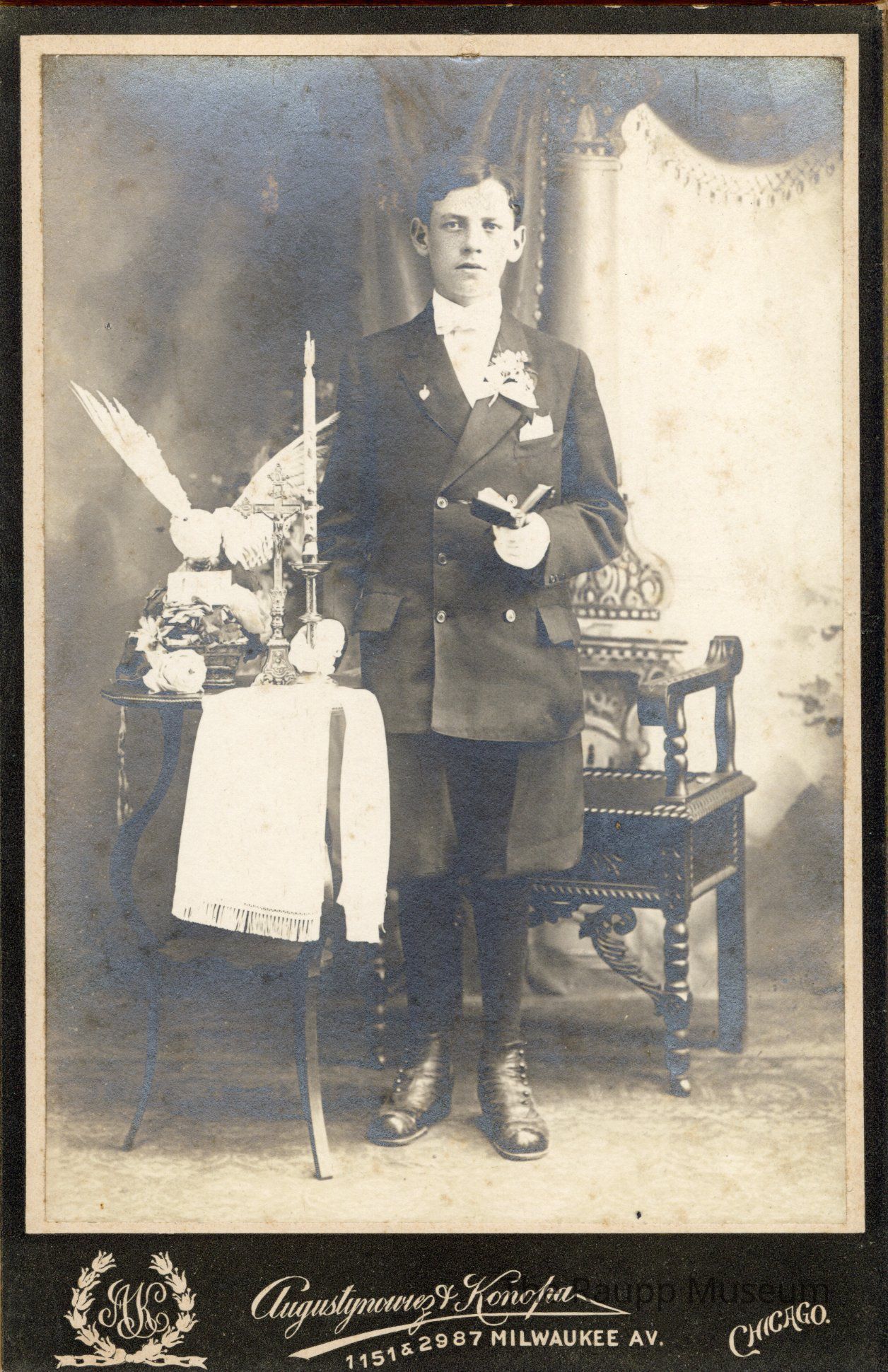 The photo is attached to a dark green mat board. On the bottom is printed in white ink: "AK, Augustynourez & Konopa, 1151 & 2987 Milwaukee Av. Chicago".Dimensions