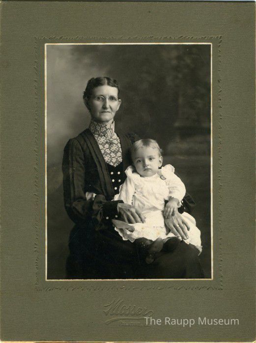 Portrait image of a woman, Ursula Weidner Spoerlein seated on the left with a child, nephew Raymond Weidner seated in her lap. She is wearing glasses with her hair pulled tightly against her head. She is wearing a tall lace blouse, dark vest with two rows of white buttons and pin-tucked jacket. He is wearing a white ruffled dress.Relationships