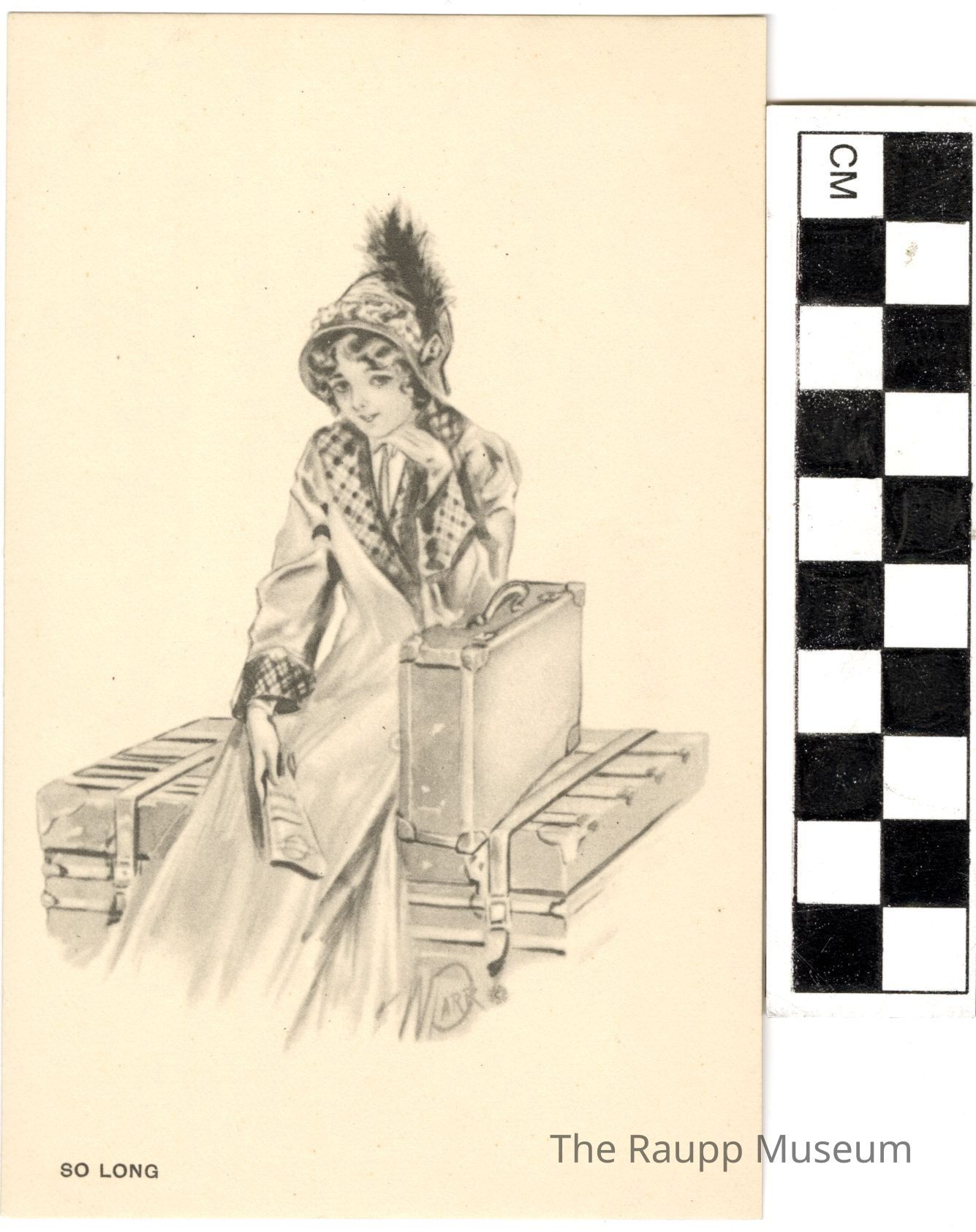 One (1) beige and black paper postcard. On the front is a drawing of a women sitting on a large suitcase, with her left arm leaning on another small case. She is wearing a long coat with checkered design on the ends and opening. She has a bowl hat on with a black feather in the side. She is holding a paper in her right hand. On the bottom is printed: "So Long". On the bottom of the picture is signed "Warr", "©".