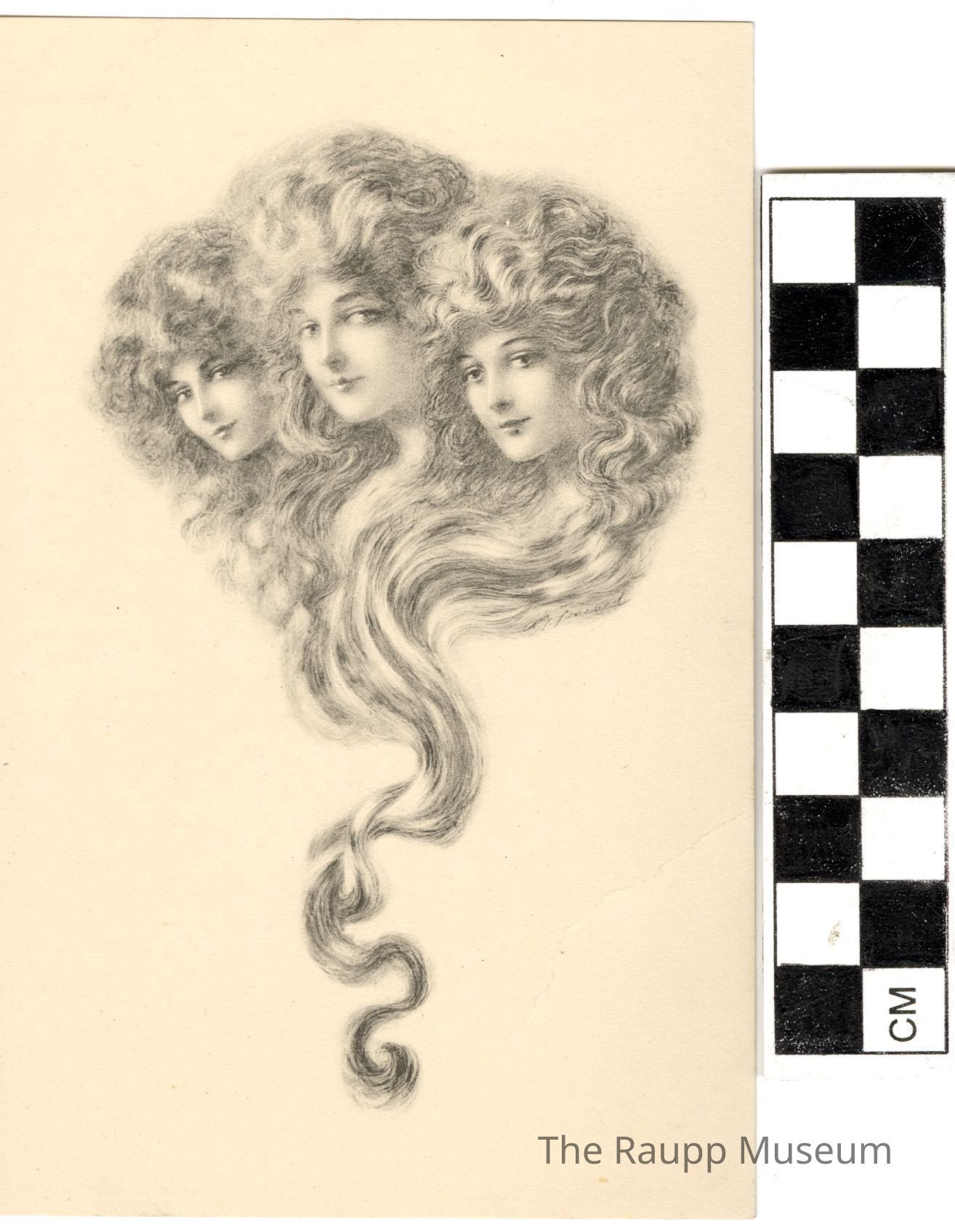 One (1) beige paper postcard. On the front is black and white drawing of three women's heads, all with curly hair that falls down together into the same strand in the center of the card.