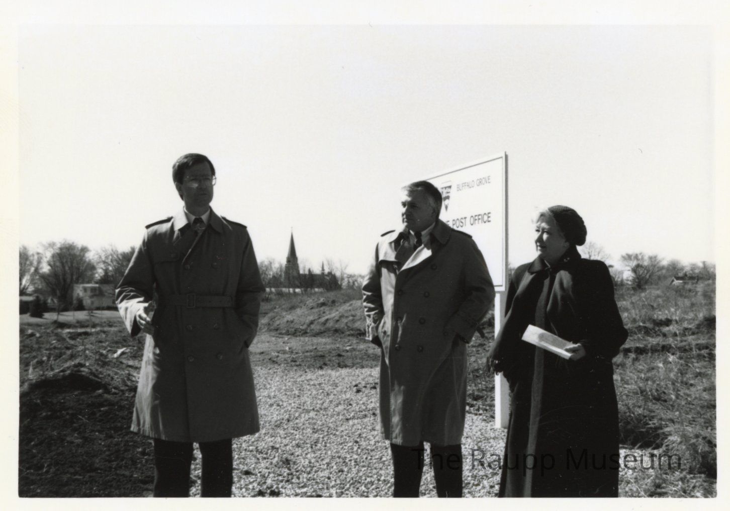 One (1) black and white photograph of Verna Clayton and two men in front of the construction sign for the Post Office groundbreaking in Buffalo Grove. Everyone is wearing long coats. St. Marys is in the background.Made/Created