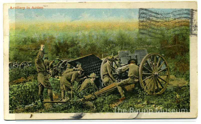 Color postcard of the “Artillery in Action” With image of men in the field loading artillery. Cancelled stamp mark on upper right.
