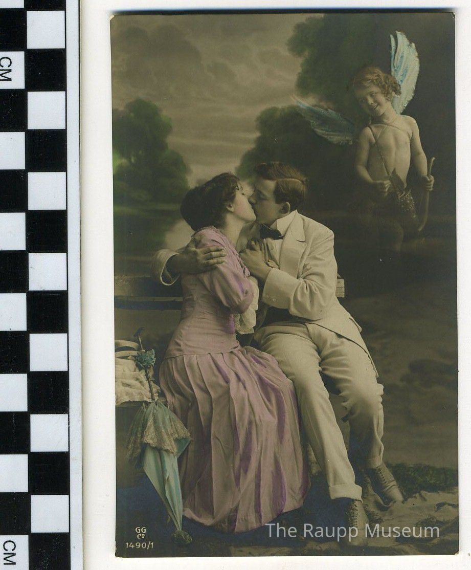 Black and white GG Co postcard. Image of a couple seated on a bench and kissing with a Cupid child with wings hovering on the right. Image has been hand colored. Woman's dress is purple and the child has blue wings. Postcard has divided back.
