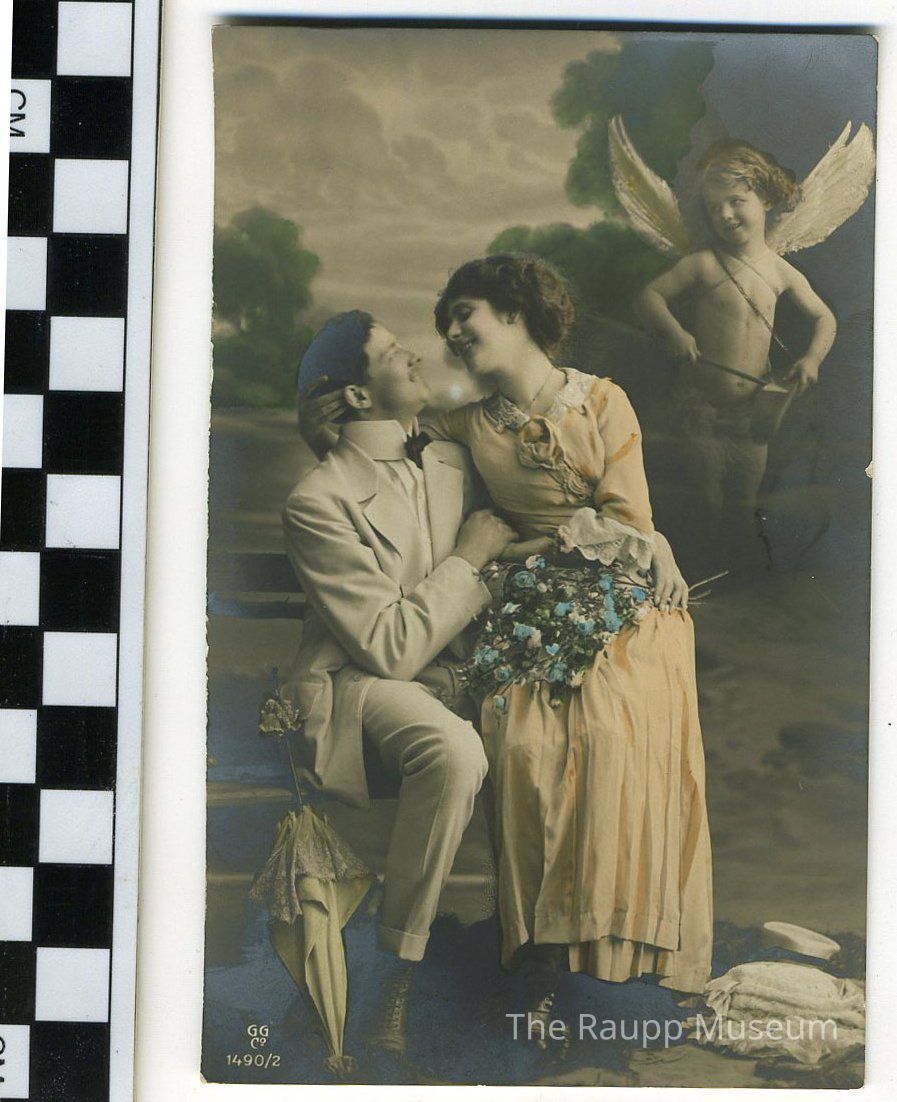 Black and white GG Co postcard. Image of a couple seated on a bench with a Cupid child with wings hovering on the right. Image has been hand-colored. Woman's dress is orange and is holding a blue bouquet in her lap. Postcard has divided back, printed in Germany.