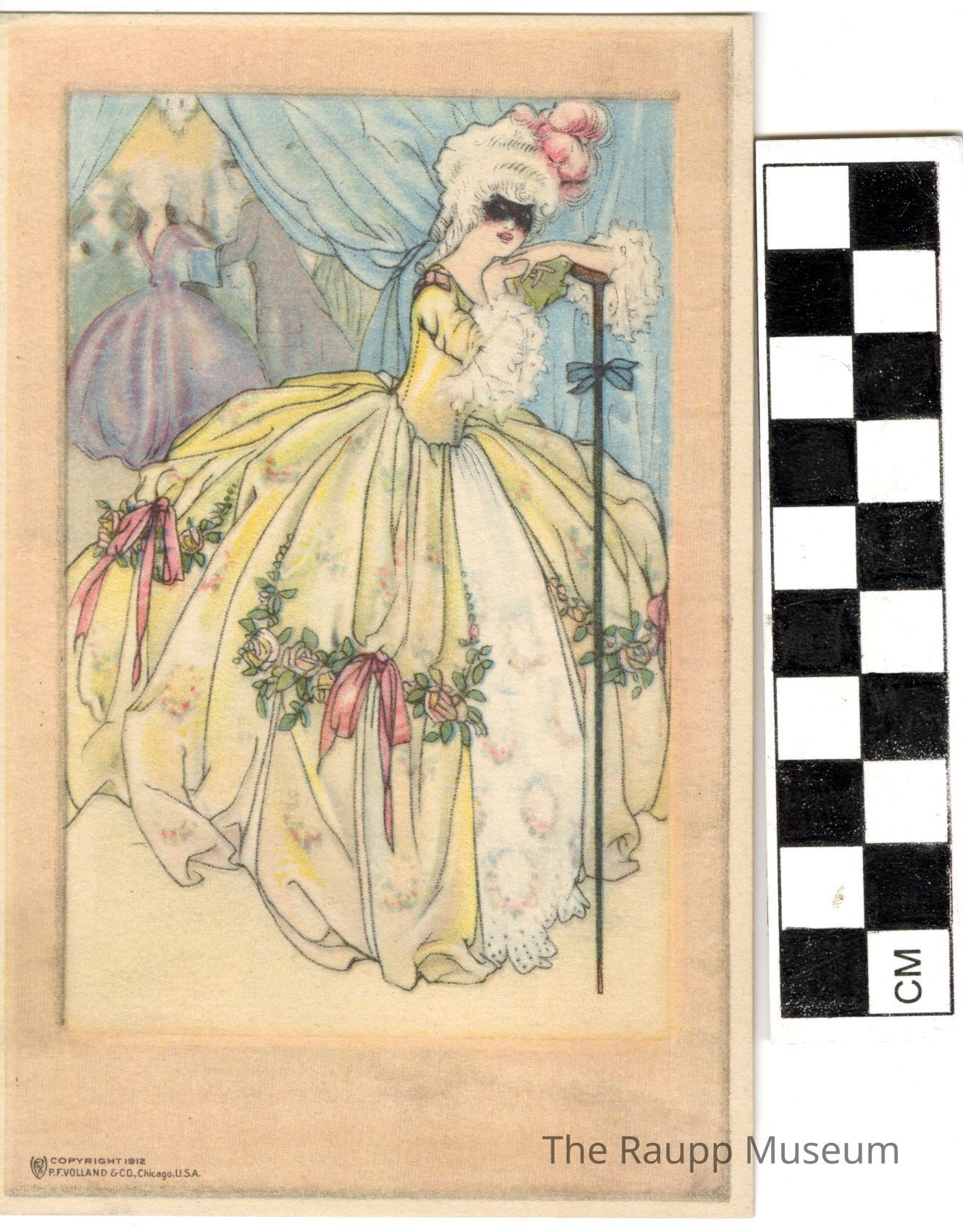 One (1) beige, pink, green, blue, and yellow postcard. On the front is a drawing of a girl in a large yellow ballgown with pink flowers and ribbons with leaves tied along the center of the skirt, and a white center piece. The sleeves are elbow length with white ruffles on the end. She has a white wig on with a pink feather piece and a black mask over her eyes. She is leaning against a brown cane with blue bow attached. Behind her is a blue curtain and other men and women can be seen. On the bottom left corner is written "Copyright 1912, P.F. Volland & Co. Chicago, USA".Archive Details