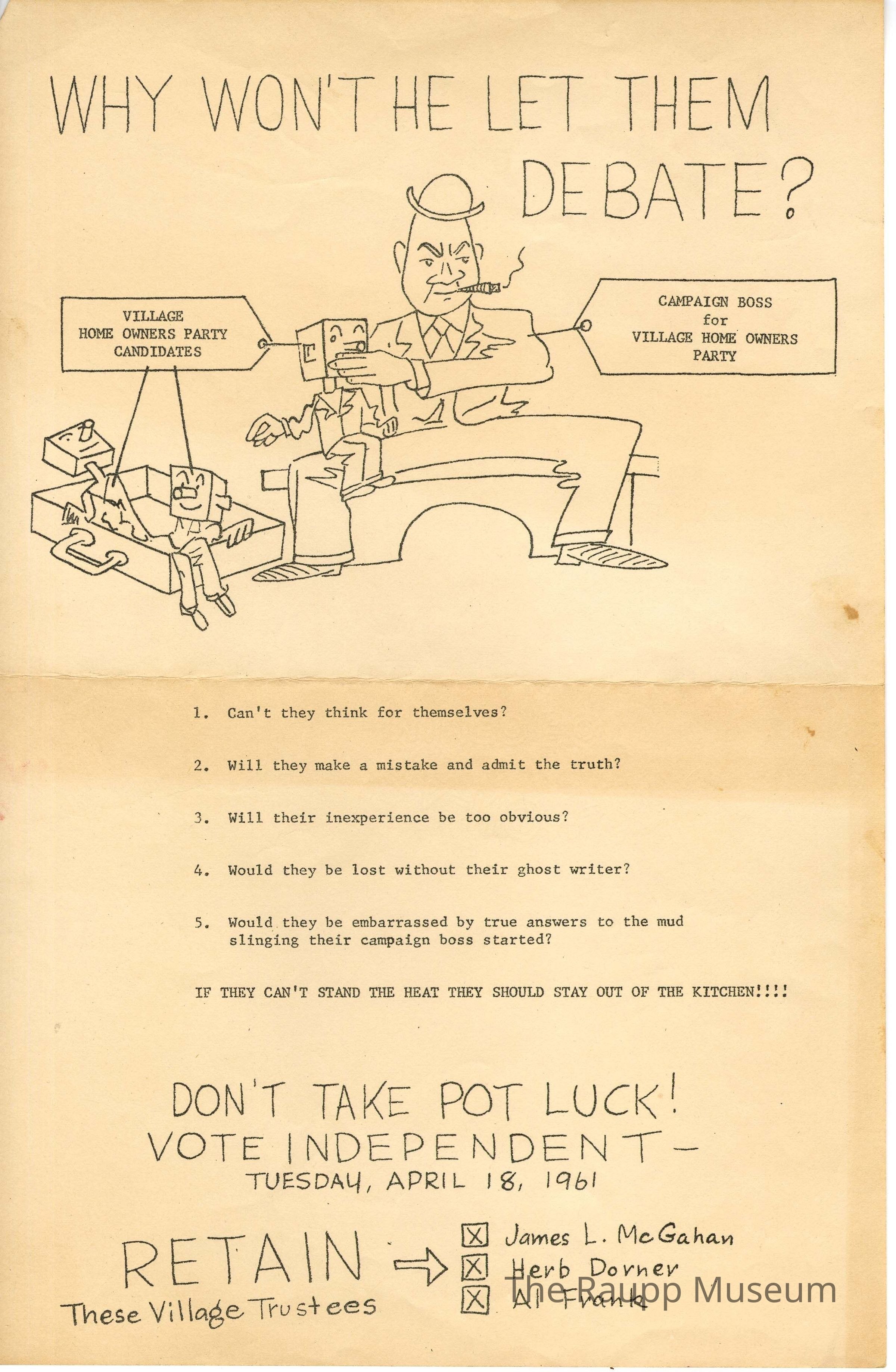 One (1) political poster for the Buffalo Grove Village Trustees election in 1961. Poster is legal size with the title "Why won't he let them debate?" with a cartoon of a man in a suit, holding puppets of the Village Home Owners Party Candidates. Beneath the cartoon are 5 questions and who to vote for in the election on April 18, 1961.Archive Items Details