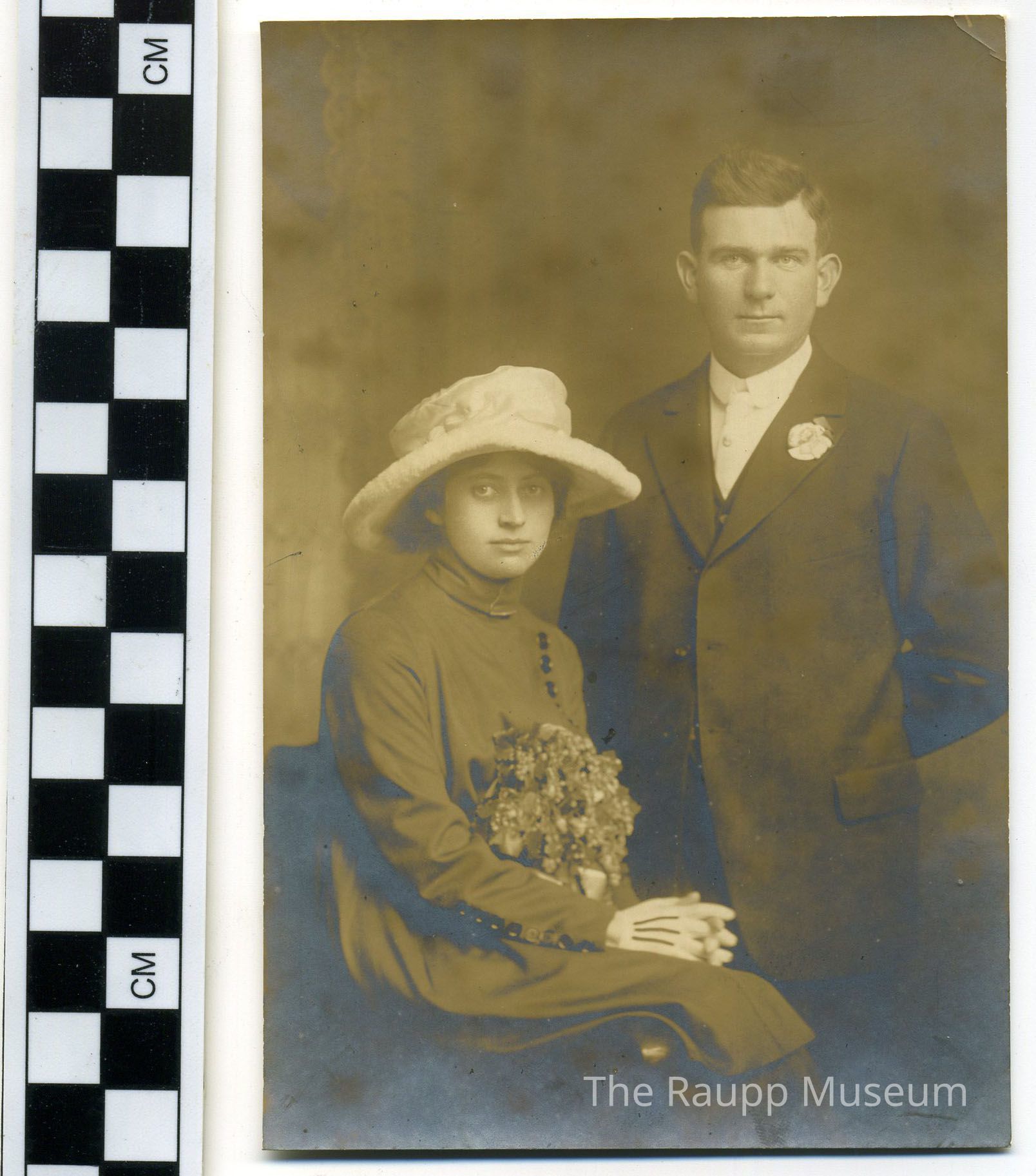 Black and white print with sepia tones. Portrait image of a couple. The woman is seated on the left wearing a large hat and holding a bouquet of flowers in her lap. She is wearing a long jacket with a vertical row of asymmetrical front button closures on her shoulder and forearm. The man is standing on the right with his hands behind his back and wearing a white necktie and unbuttoned jacket with a small boutonniere.Dimensions