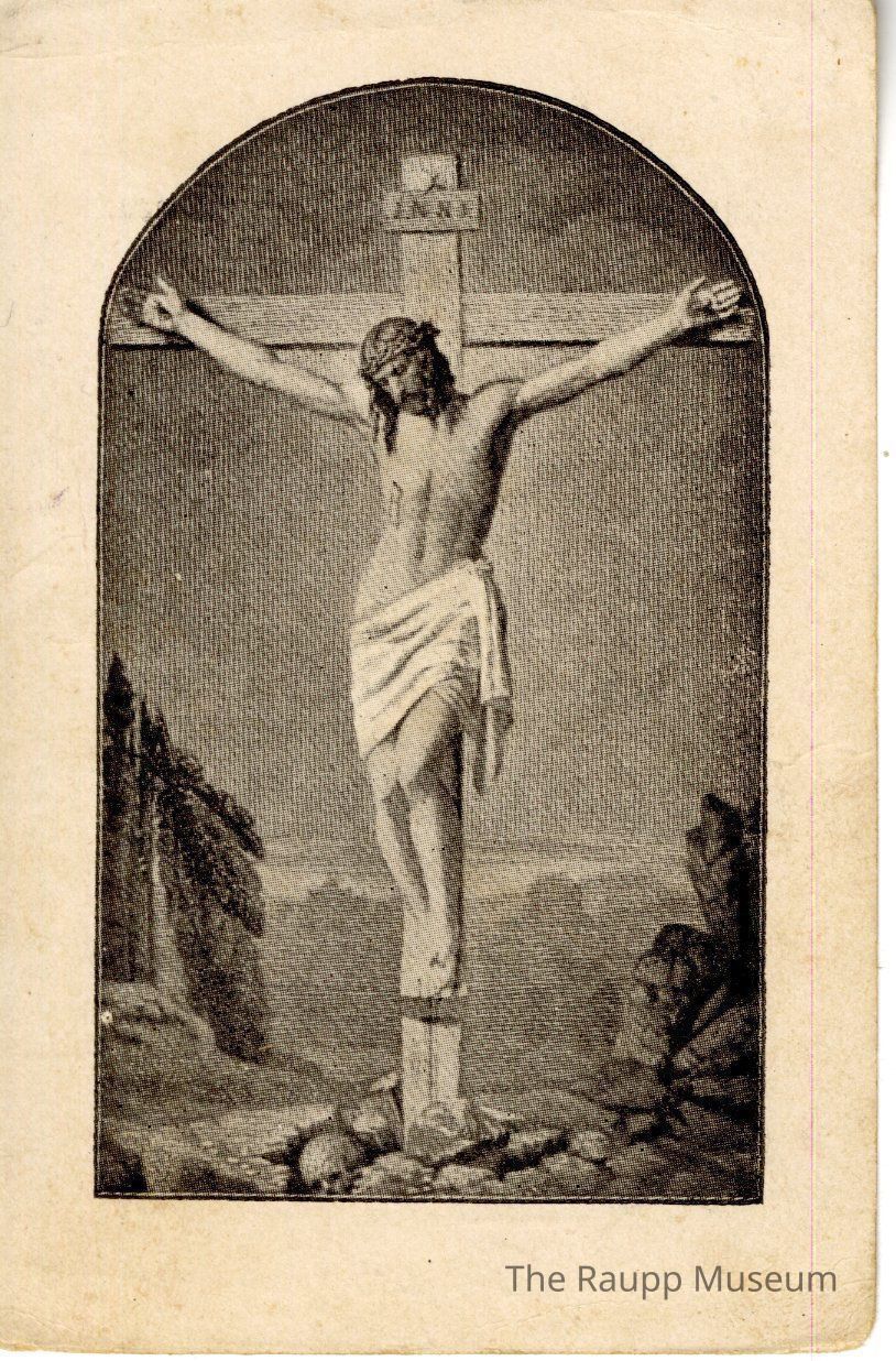 One (1) 2-sided prayer card. One side has a black and white illustration of Jesus on the cross, with a skull on the ground, and rocks in the background. The other side has a prayer in German.Archive Details
