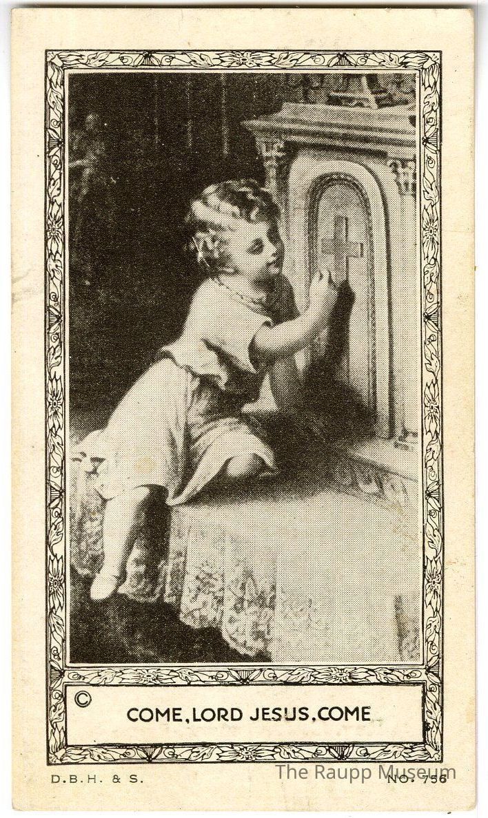 One (1) 2-sided prayer card. One side has an illustration of a young girl looking and reaching her hand out to a cross on an alter with the text "Come, Lord Jesus, Come" underneath. The other side has text "Remembrance of the Mission Given by the Oblate Father Rev. A.H. Rosenthal, O.M.I. at St. Mary's Church"Archive Details