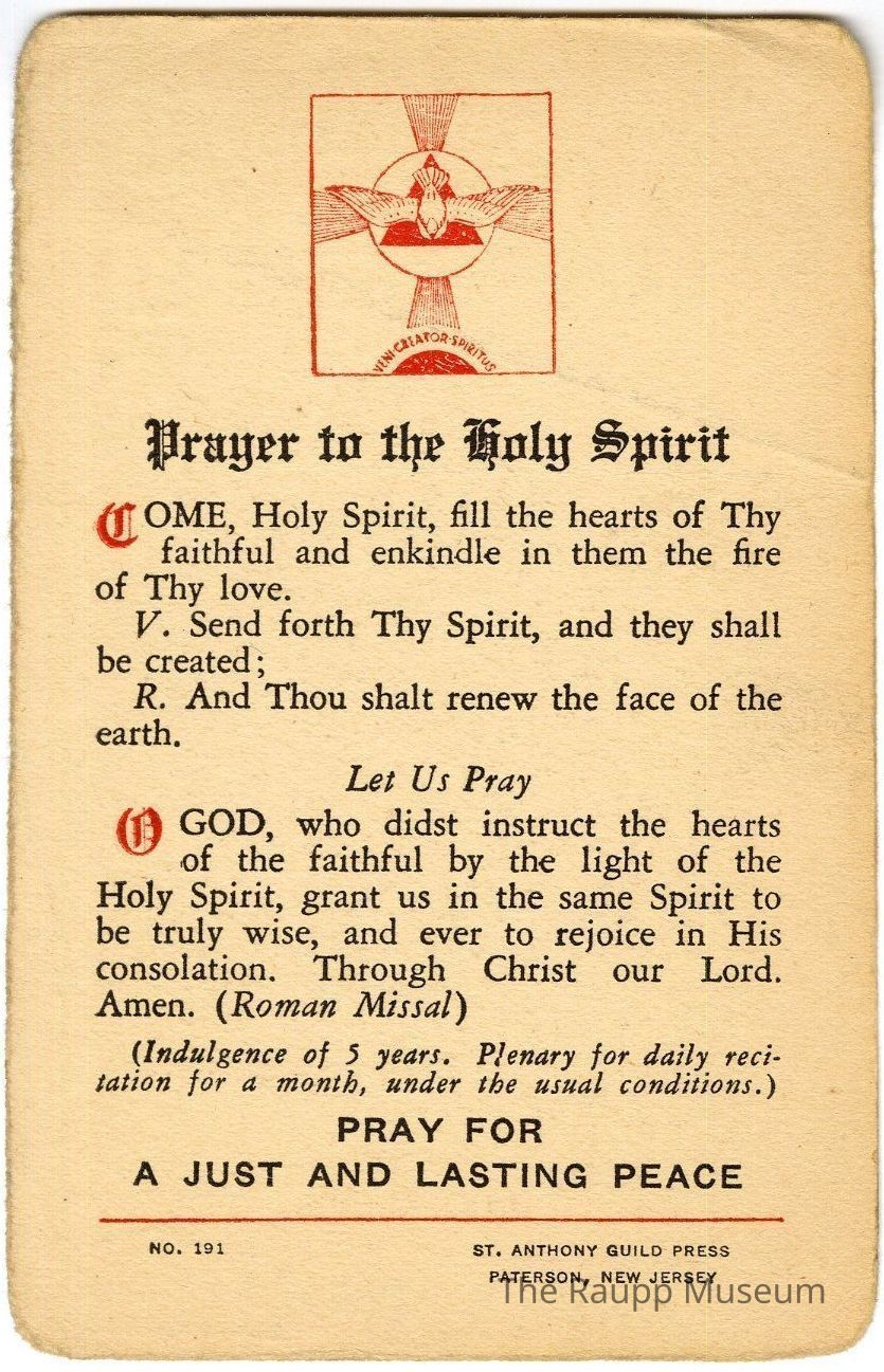 One (1) 1-sided prayer card. There is a small image at the top of a triangle with wings, and its in red ink. Underneath the image is text of a "Prayer to the Holy Spirit"Dimensions