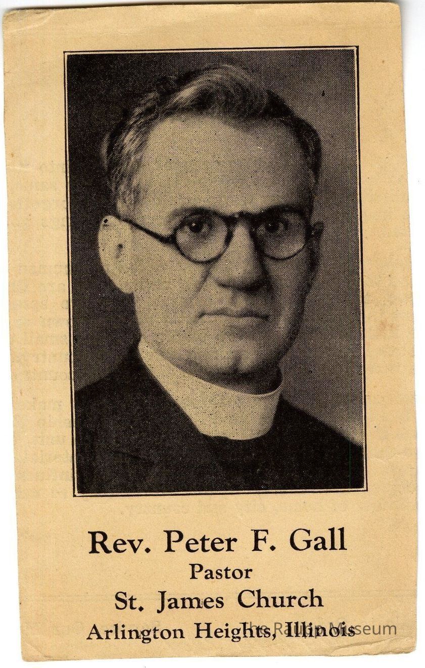 One (1) 2-sided prayer card. One side has an image of Rev. Peter F. Gall and the other side is "A message" but much of the text is cut off.Dimensions