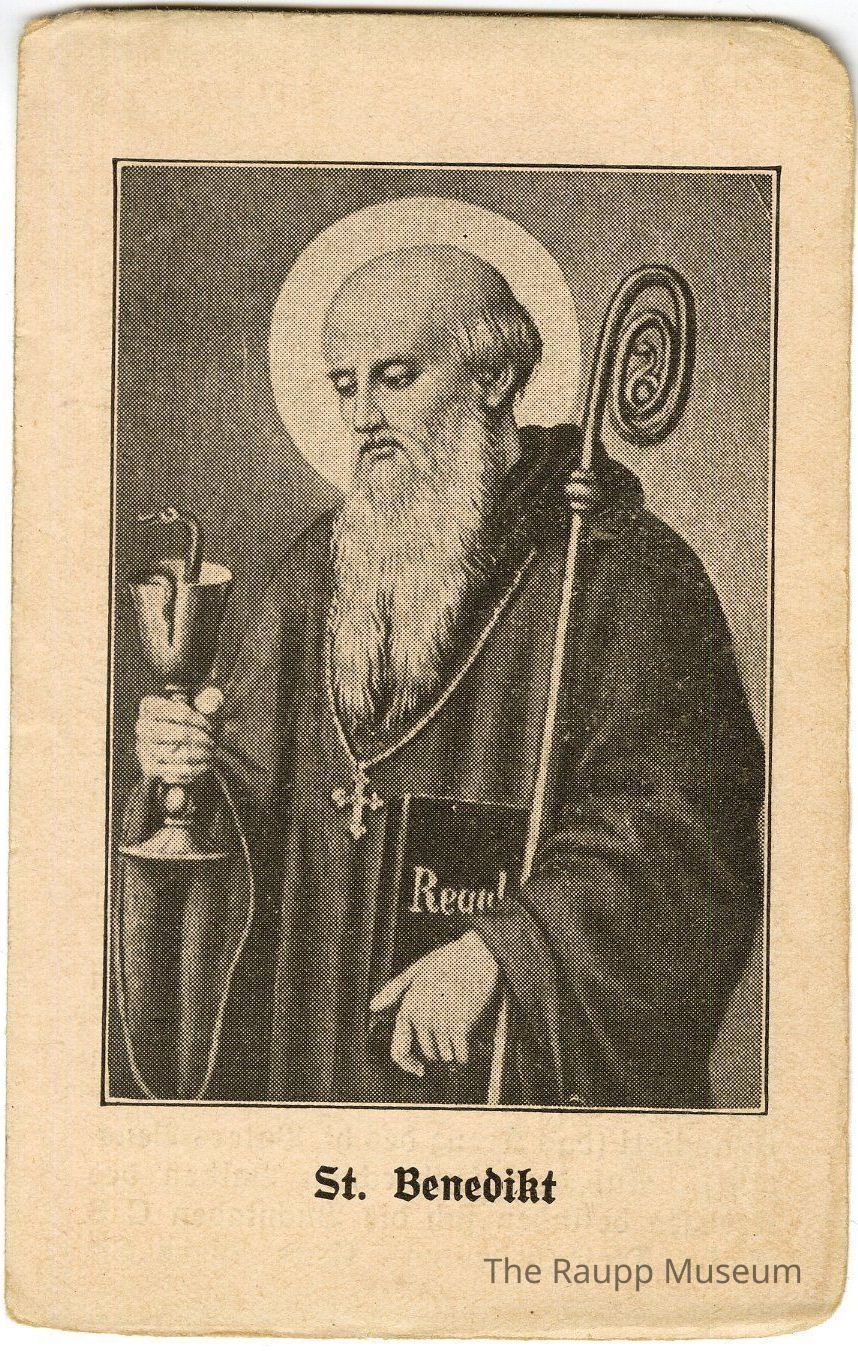 One (1) 2-sided prayer card. One side has an image of St. Benedict. The other side has a prayer in German.