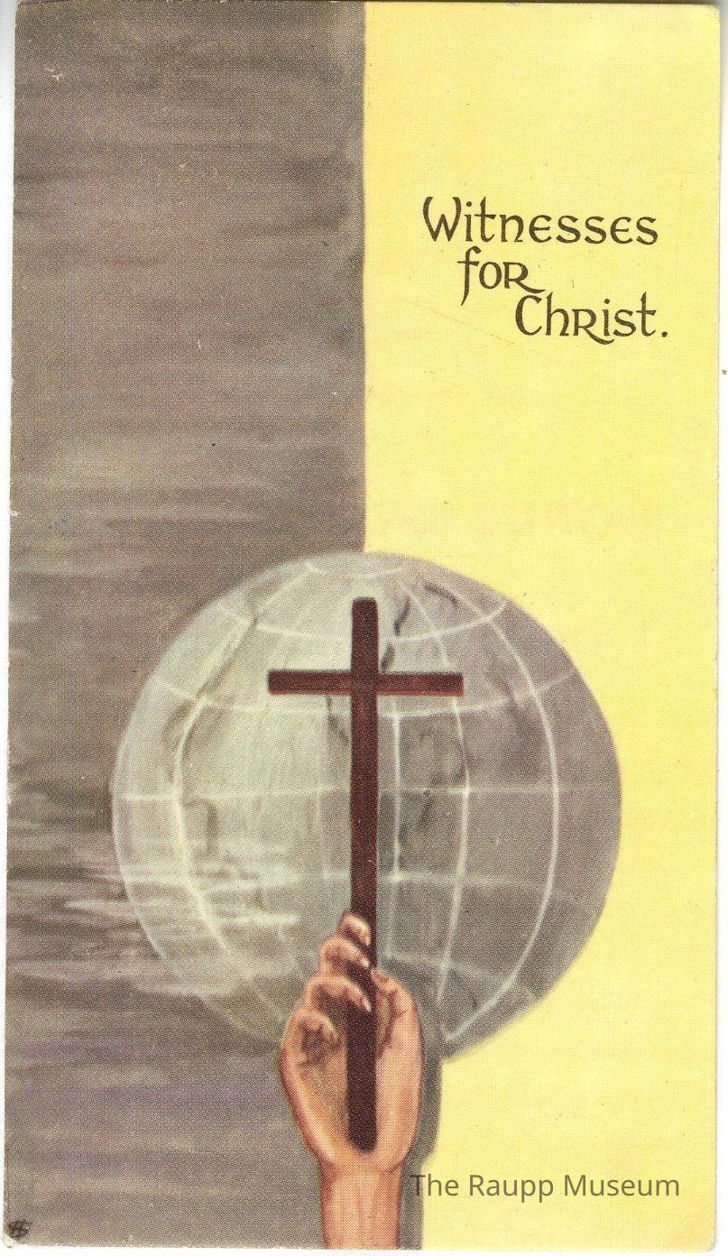One (1) 2-sided prayer card. One side has a globe with a wooden cross being held in front of it and text that reads "witnesses for christ" over a yellow background. The other side has text that says