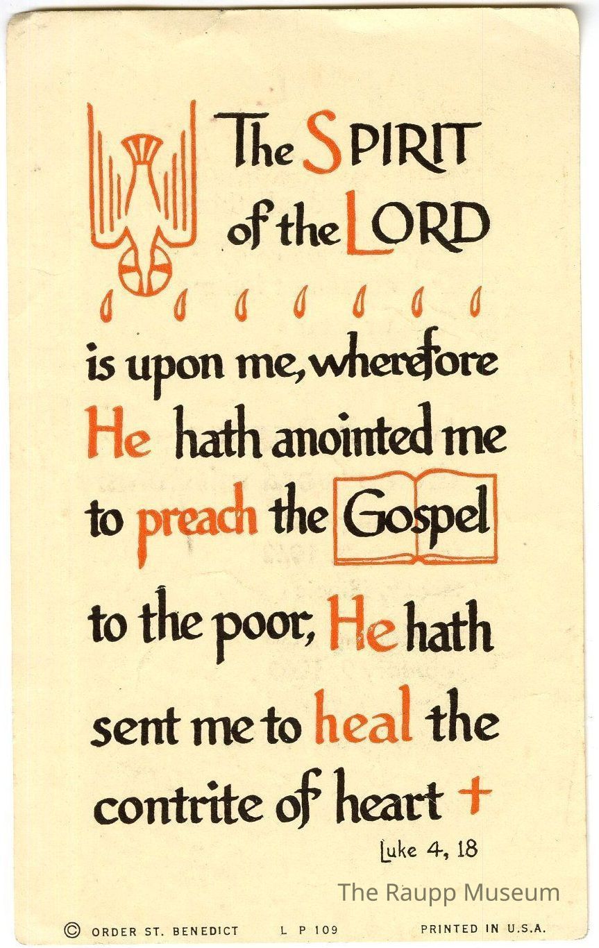 One (1) 2-sided prayer card. One side has text that reads "The Spirit of the Lord is upon me, wherefore He hath anointed me to preach the Gospel to the poor, He hath sent me to heal the contrite heart" The other side is a prayer and text that reads