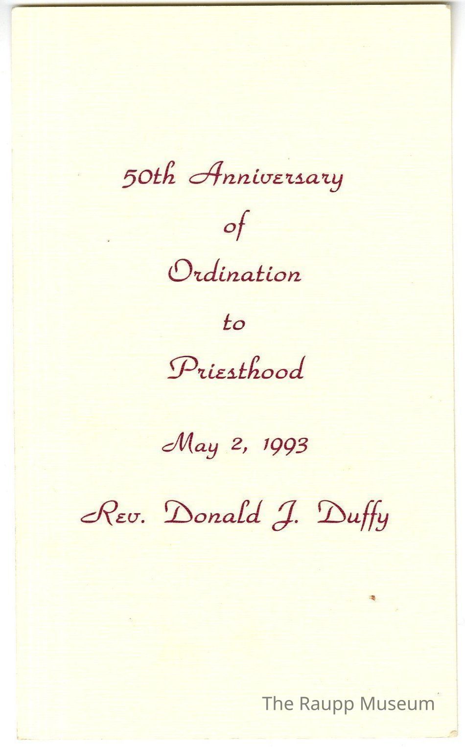 One (1) 2-sided prayer card. One side has raspberry colored text that reads "50th Anniversary of Ordination to Priesthood May 2, 1993 Rev. Donald J. Duffy." The other side has two images near the top, one in a metallic gold of a goblet, and the other in the raspberry color of hands reaching out holding a bowl of some sort. Underneath these images text "Thou Art a Priest Forever" with a long quote underneath it.Archive Details