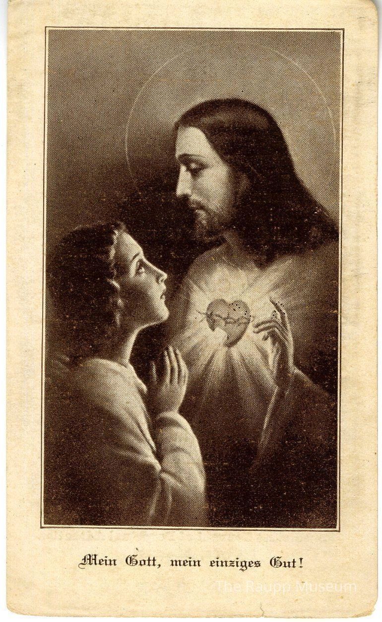One (1) 2-sided prayer card. One side has an illustration of Jesus looking down at a woman who is looking up to him. The other side has a prayer in German.Dimensions