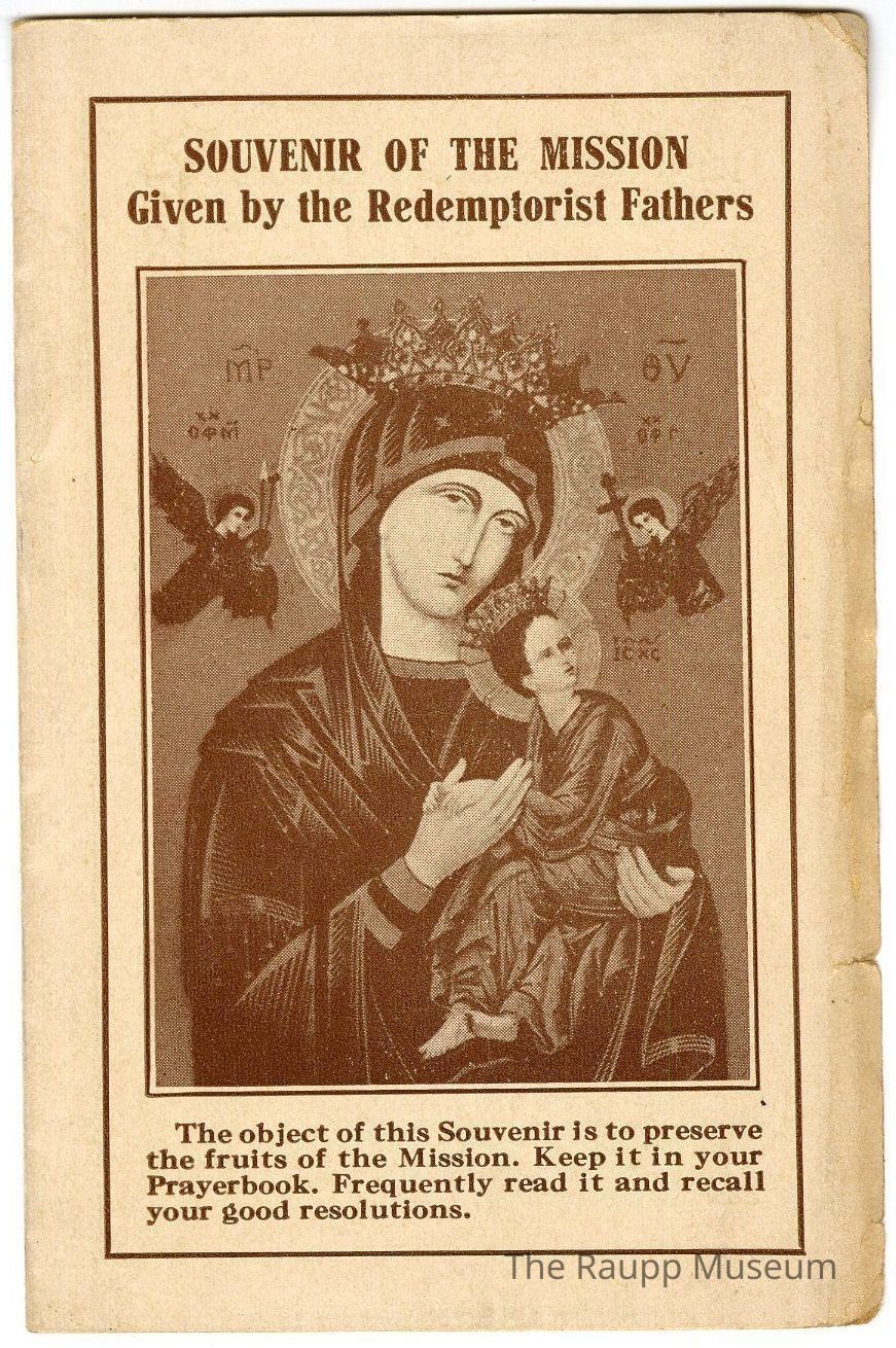 One (1) 2-sided prayer card. One side has an image of a man with a crown holding a tiny woman who also has a crown on, as two angels fly near is head. There is text above the image that reads "souvenir of the mission given by the redemptorist fathers" and text below that describes the purpose of the souvenir. The other side has text that begins with "means of perseverance"Archive Details