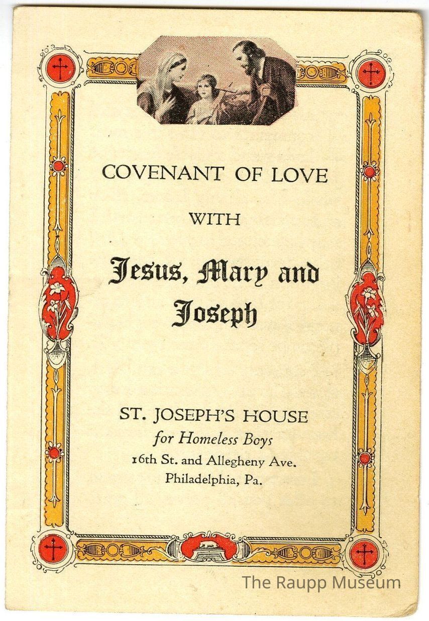 One (1) 2-sided prayer card. One side has text that reads "Covenant of love with Jesus, Mary and Joseph" With an image of the three of them at the top with a colorful orange and yellow border stemming out of the image. The back side has the same border with text that is a "Memorare of St. Joseph"