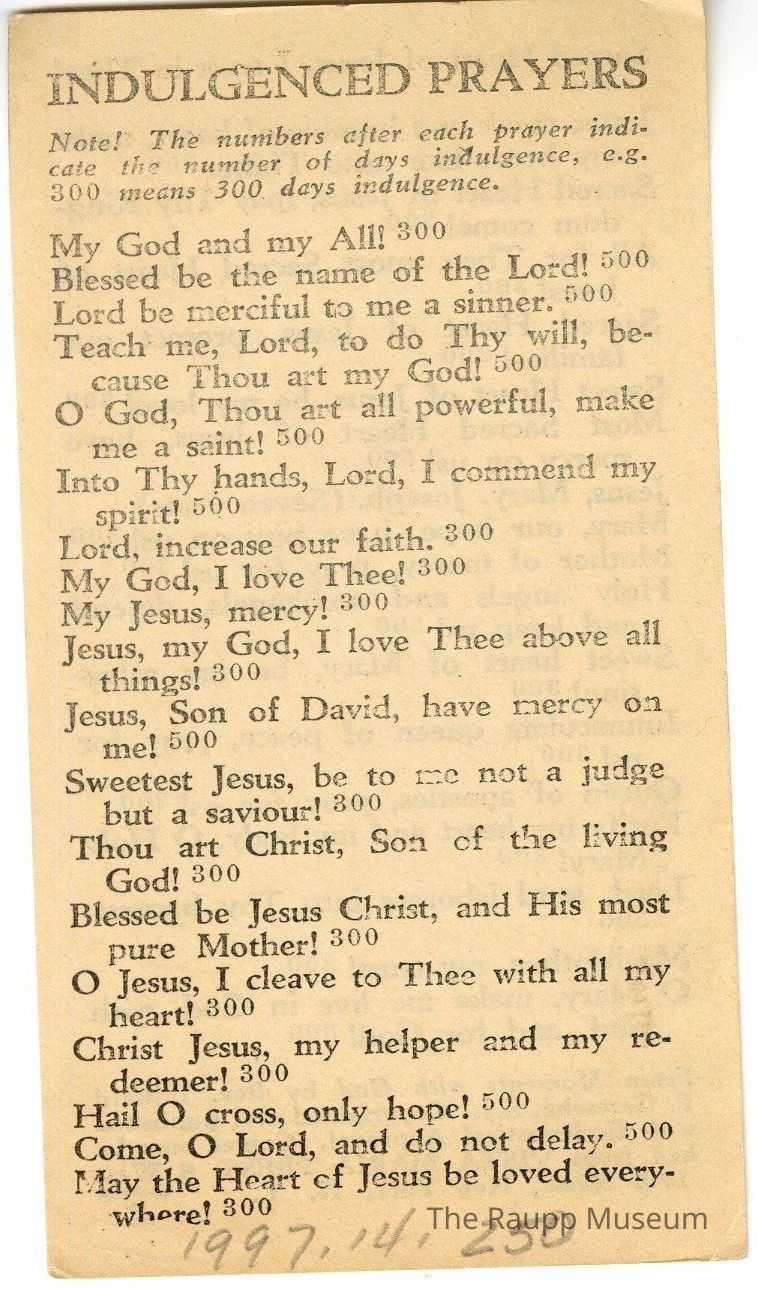 One (1) 2-sided prayer card. One side has an Indulgenced Prayers and the other side continues it.