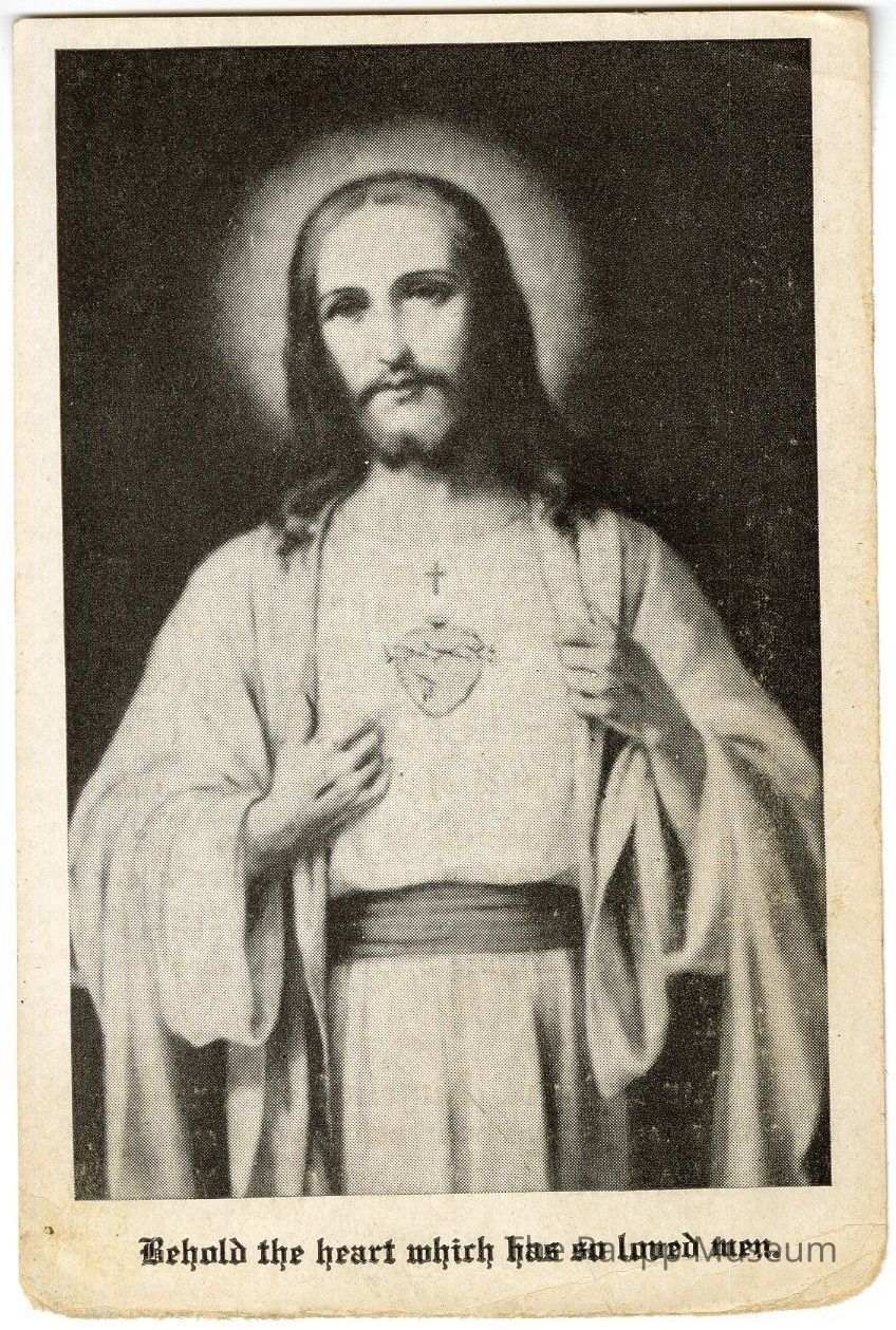 One (1) 2-sided prayer card. One side has an illustration of Jesus with text underneath that reads "Behold the heart which has so loved men." The other side has a "Prayer of Petition"Dimensions