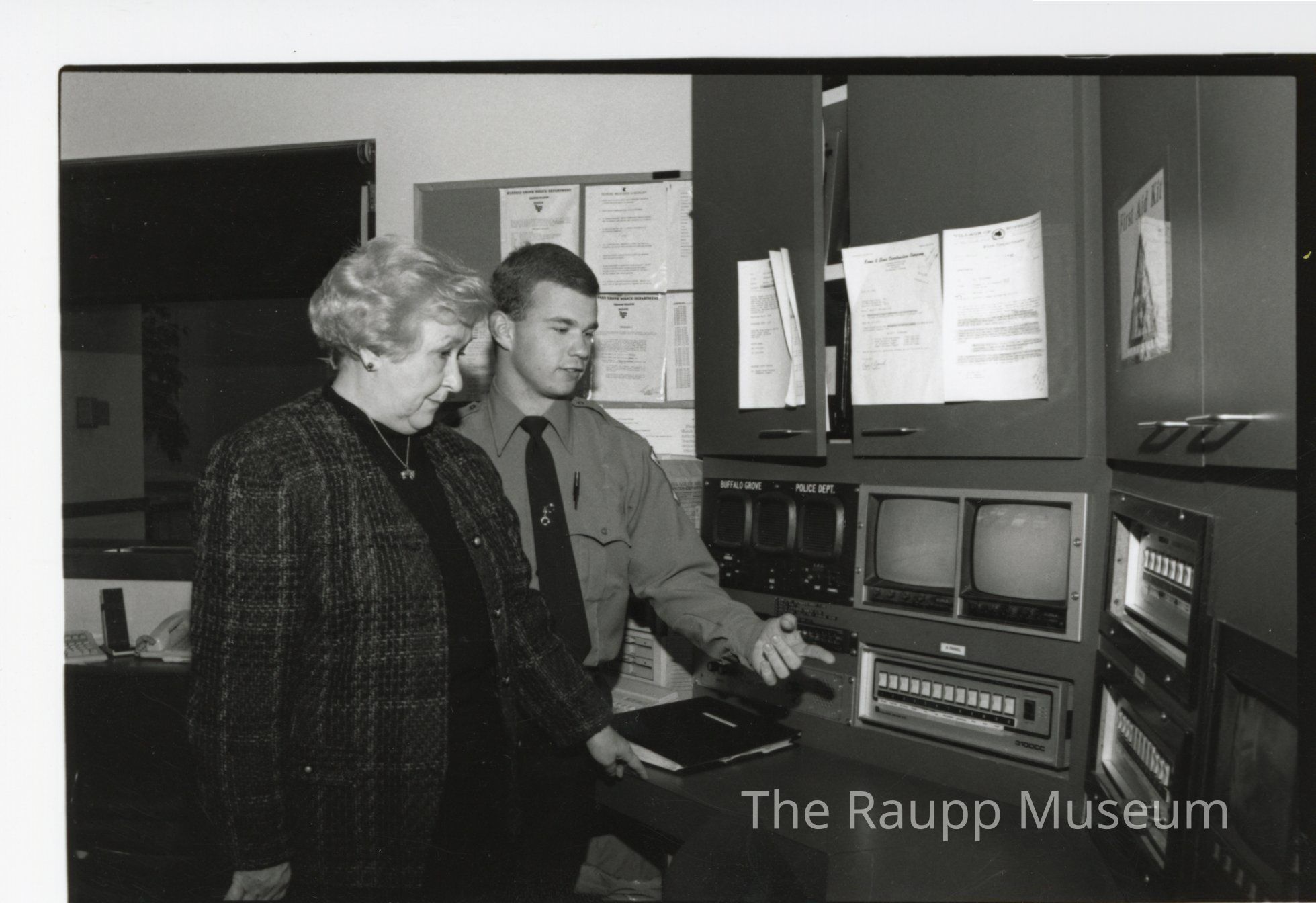 One (1) black and white photograph of village president Verna Clayton and a young desk officer Jim Ryan. Ryan is standing behind the president Verna pointing to a computer. There are screens and computer on the wall with cabinets above at the police station.Made/Created