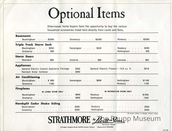 Black and white price list for optional features in the Strathmore line of Levitt and Sons homes. Document printed on off-white semi-gloss paper with black line border. Titled: "Optional Items."Archive Details