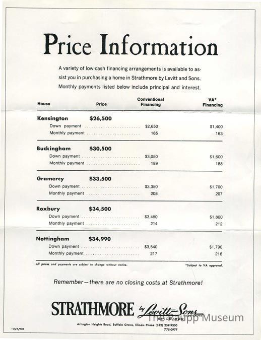 Black and white price list for the Strathmore line of Levitt and Sons homes. Document printed on off-white semi-gloss paper with black line border. Titled: "Price Information."Archive Details