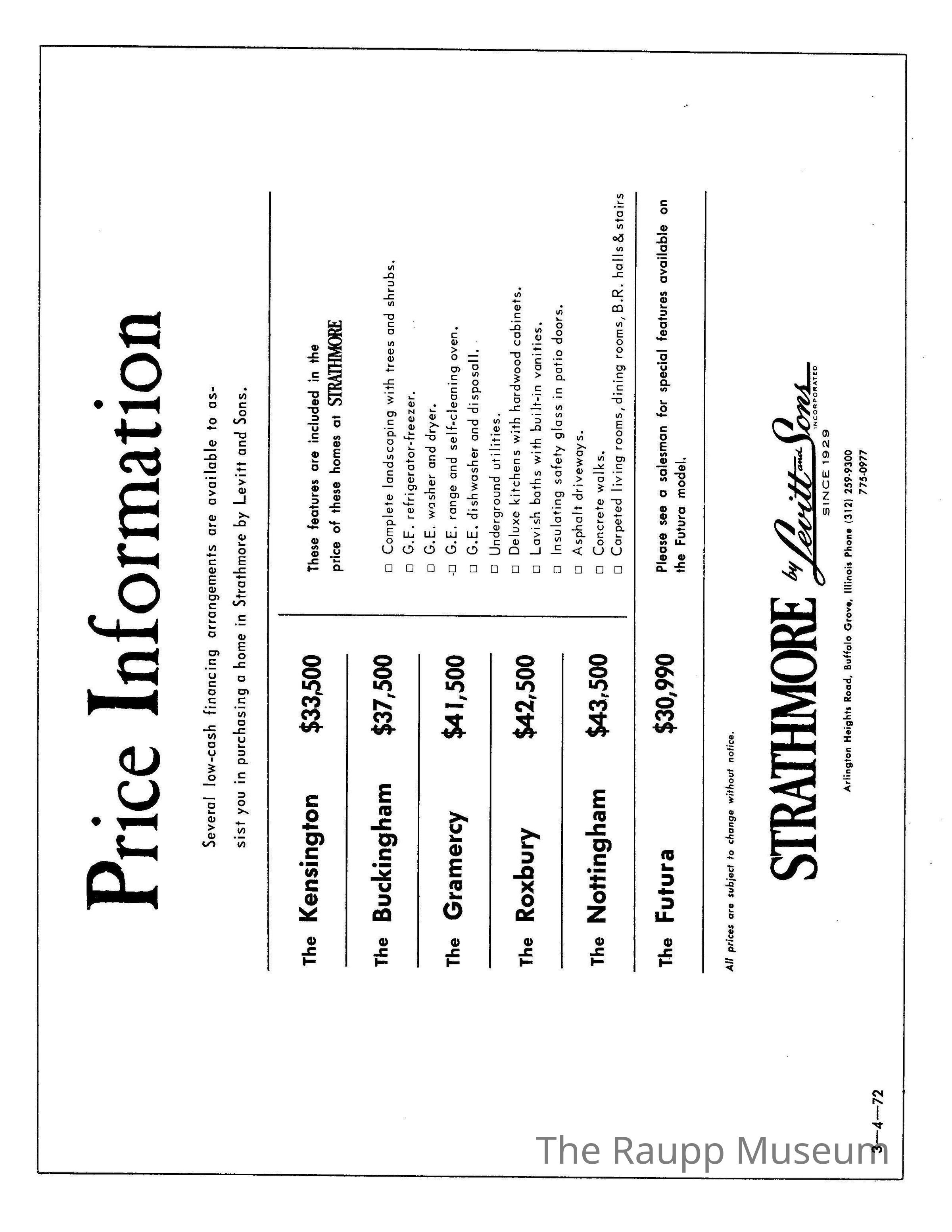 One (1) glossy white information sheet about "Price Information" for the Strathmore by Levitt and Sons homes. The sheet has black text and contains prices for six homes. It also lists features that are included in the price of the homes. This sheet in contained in and marketing booklet folder with six other sheets. (see 2004.12.001A-I)