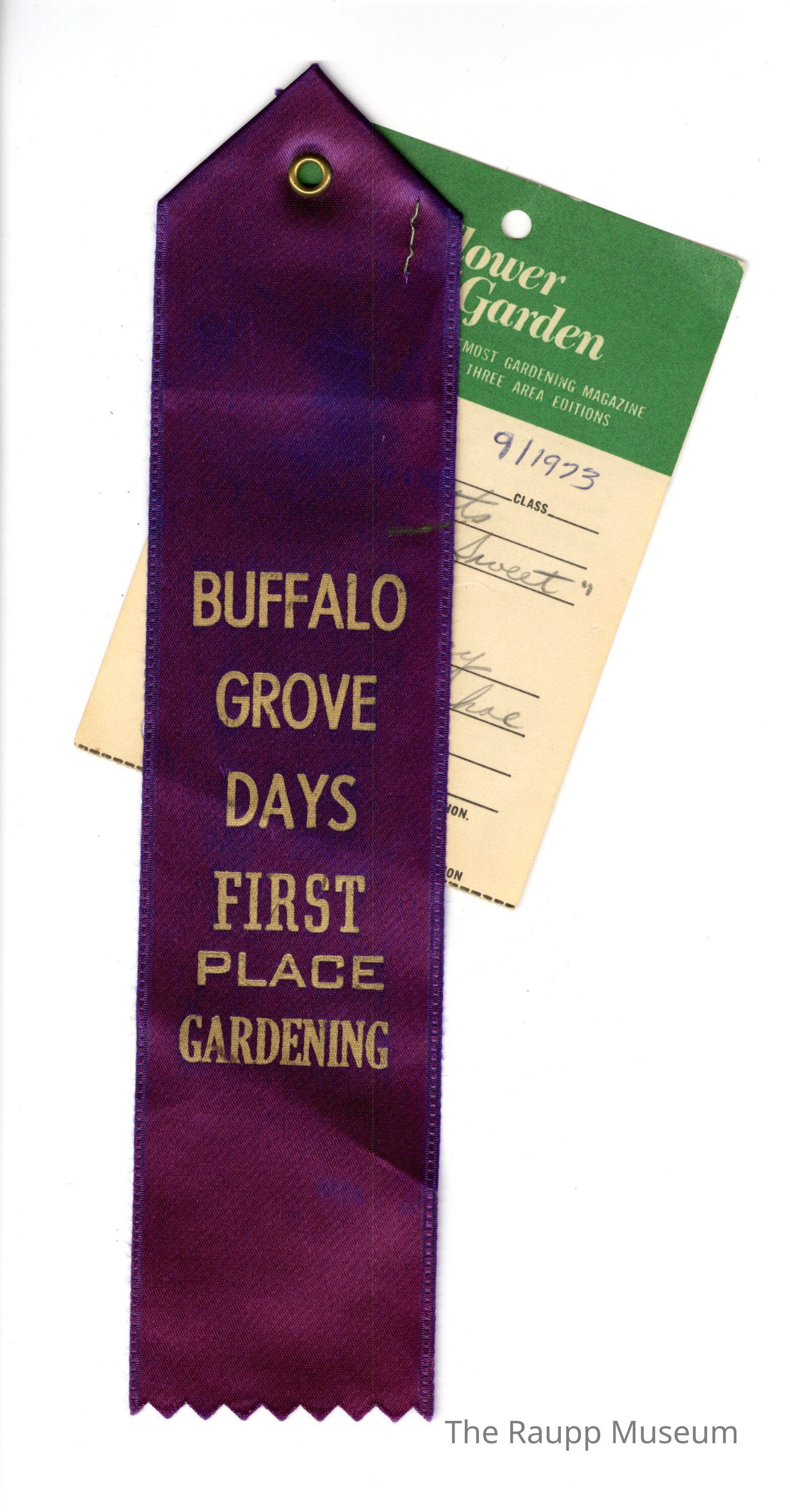 One (1) purple and gold Buffalo Grove Days rectangular ribbon. Ribbon is purple with gold lettering. There is a gold grommet on the top center. The gold lettering says "Buffalo Grove Days First Place Gardening". There are 2 paper tags attached and stapled to the back of the ribbon. One paper tag is tucked underneath the ribbon on top, and has spaces for "Contestant, Time, Date, Judge". Another paper is stapled to this one, with green part on top, with "Flower and Garden" as the title, and white underneath with spaces to fill in the contestant information. Handwritten on this ticket is: "Carrotts, 9/1973, #40, "Tender Sweet", Don Rose, 317 Navahoe, BG". On the back is a form to order Flower and Garden magazine.