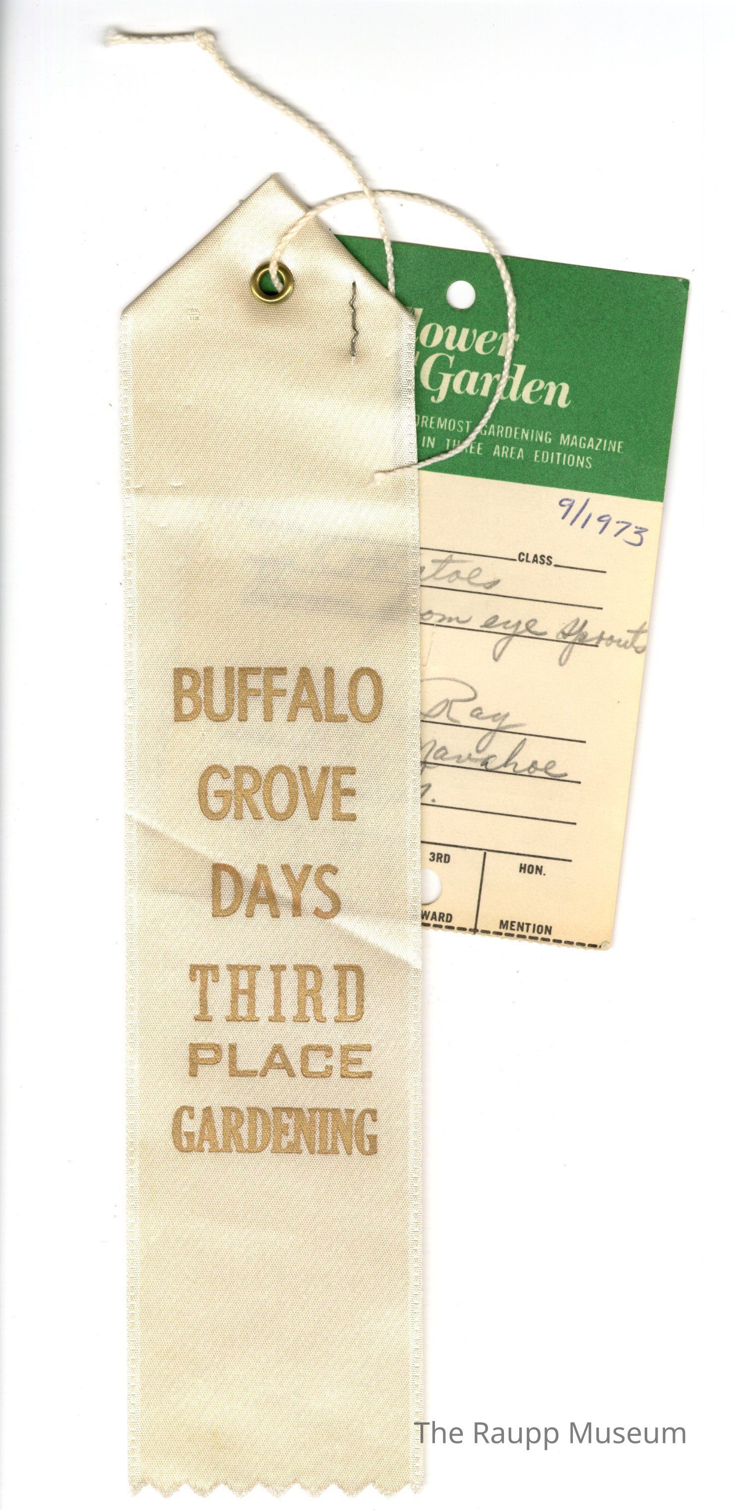 One (1) white and brown Buffalo Grove Days rectangular ribbon. Ribbon is white with brown/gold lettering. There is a gold grommet on the top center, with a white thread loop tied through it. The gold lettering says "Buffalo Grove Days Third Place Gardening". There are 2 paper tags attached and stapled to the back of the ribbon. One paper tag is tucked underneath the ribbon on top, and has spaces for "Contestant, Time, Date, Judge". Another paper is stapled to this one, with green part on top, with "Flower and Garden" as the title, and white underneath with spaces to fill in the contestant information. Handwritten on this ticket is: "Potatoes, 9/1973, #40, Grown from eye sprouts, Don Rose, 317 Navahoe, BG". On the back is a form to order Flower and Garden magazine.