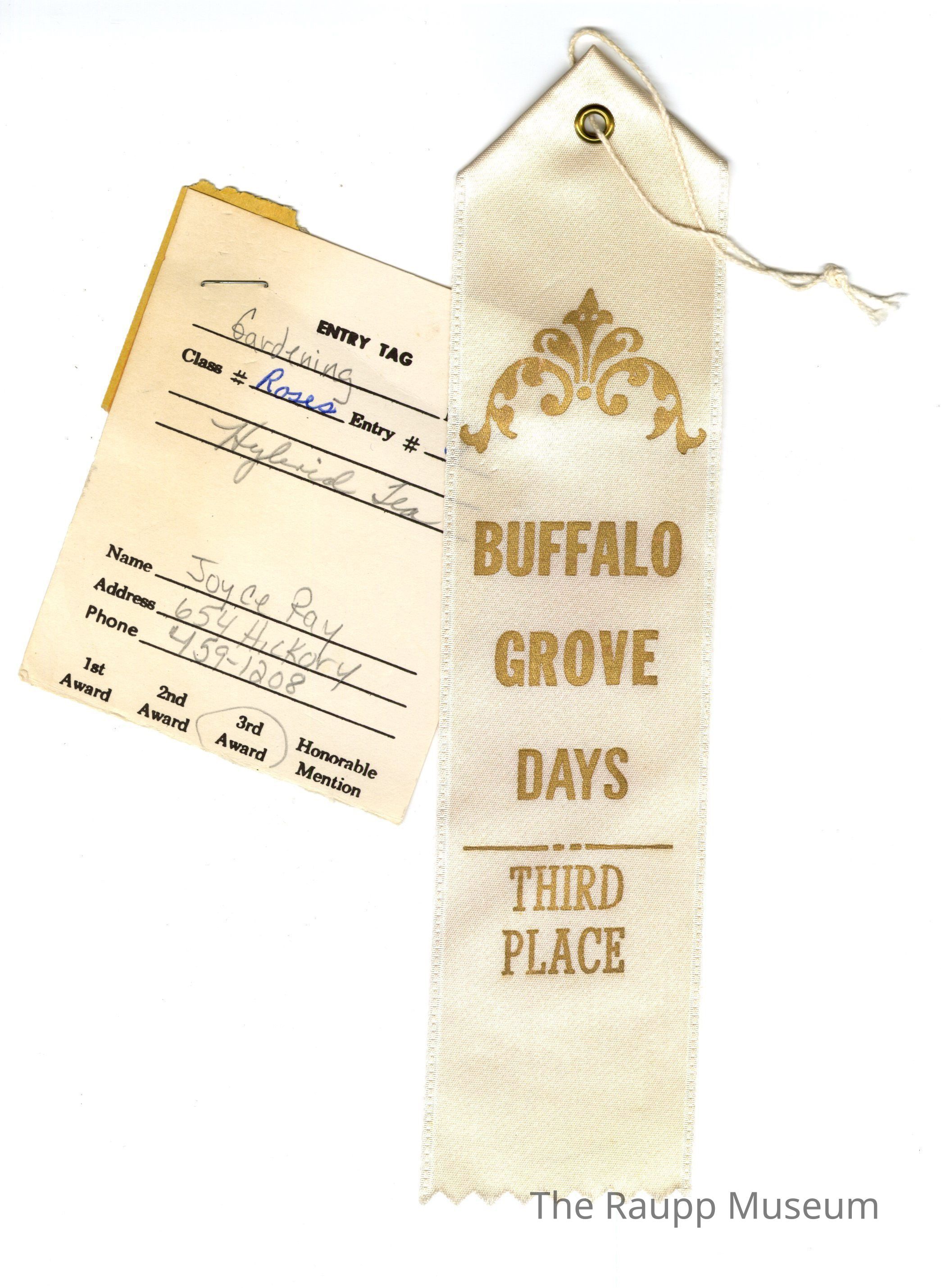 One (1) white and gold Buffalo Grove Days rectangular ribbon. Ribbon is white with gold lettering. There is a gold grommet on the top center, with a white thread loop tied through it. The gold lettering says "Buffalo Grove Days Third Place". There are 2 paper tags attached and stapled to the back of the ribbon, along with a yellow raffle ticket to the larger paper. One paper tag is tucked underneath the ribbon on top, and has spaces for "Event, Contestant, Time, Date, Judge". Another paper is stapled to this one, with Entry Tag information. Handwritten on this ticket is: "Gardening, Roses, #3, Hybrid Tea, Joyce Ray, 654 Hickory, 459-1208".