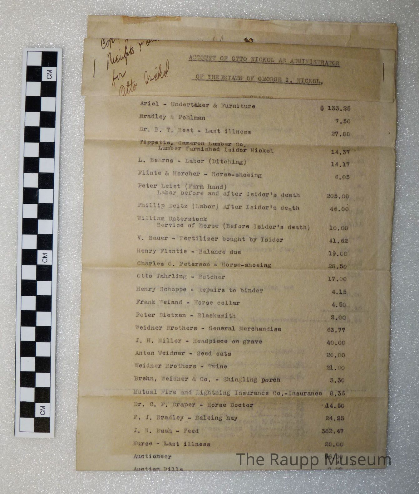 One (1) Probate Record, account of George I. Nickol estate 1906, white paper, several sheets, quarter folded (and stapled), about 12" x 8".