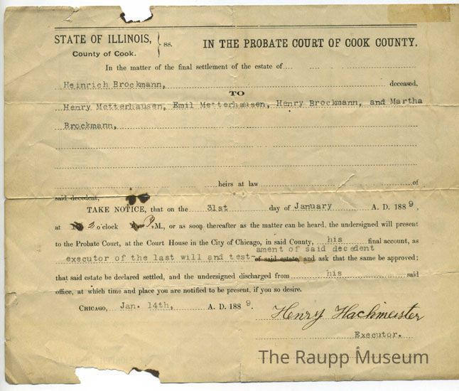 Double-sided, tan paper, bi-folded probate will for the estate of Heinrich Brockmann. With typed and handwritten contractual information. Dated Jan. 14, 1889 and signed "Henry Hachmeister, Executor."Archive Details