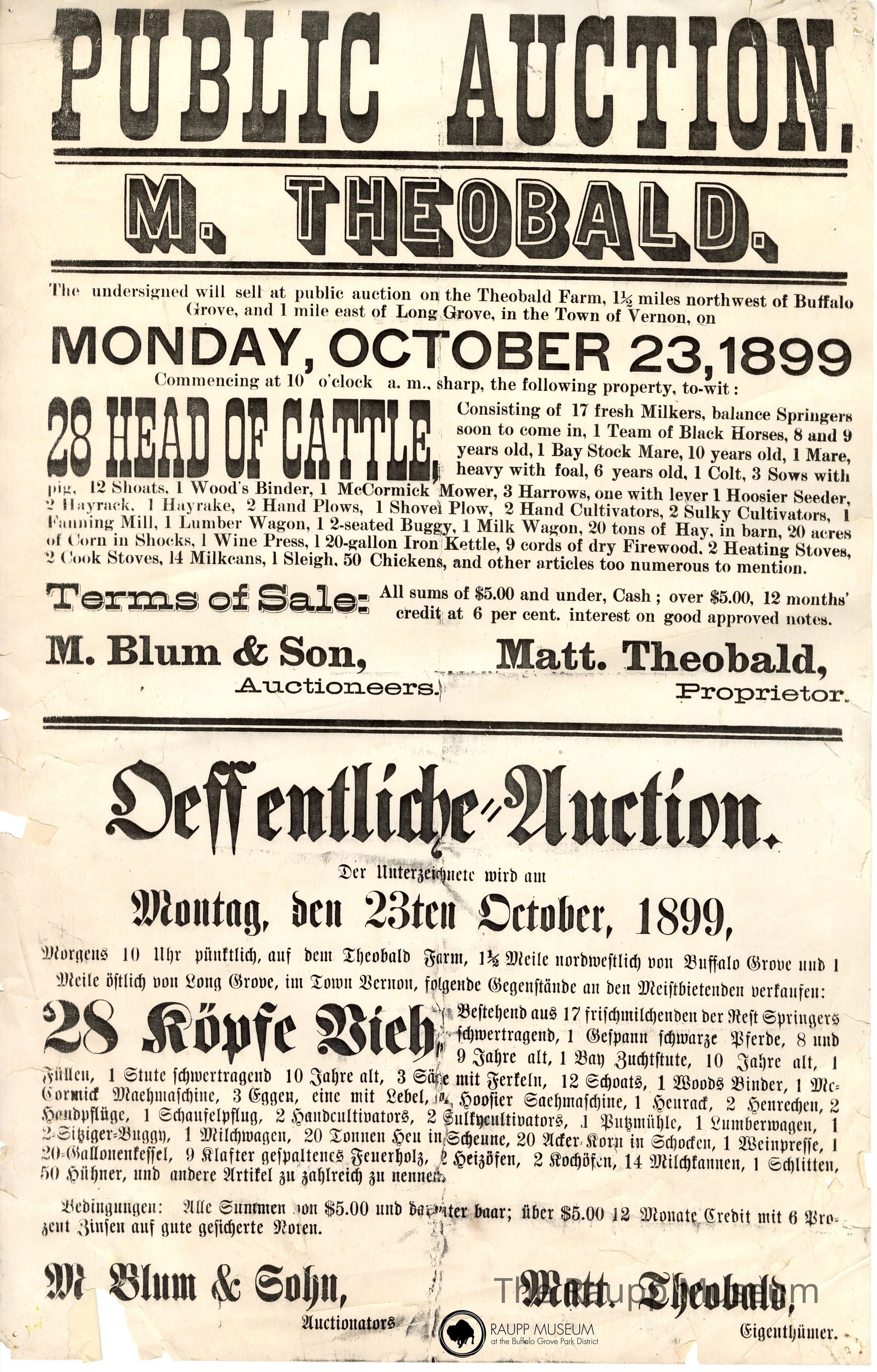 One (1) print advertisement for M. Theobald public auction of property, cattle, horses, hay, and other farm animals and equipment. The auction was set for Monday, October 23, 1899, 10AM at the Theobald Farm, 1.5 miles northwest of Buffalo Grove. The auctioneers were M. Blum and Son, the proprietor was Matt Theobald. The ad is in English on top, and German on the bottom. The text is in black printed ink on a white background.Archive Details