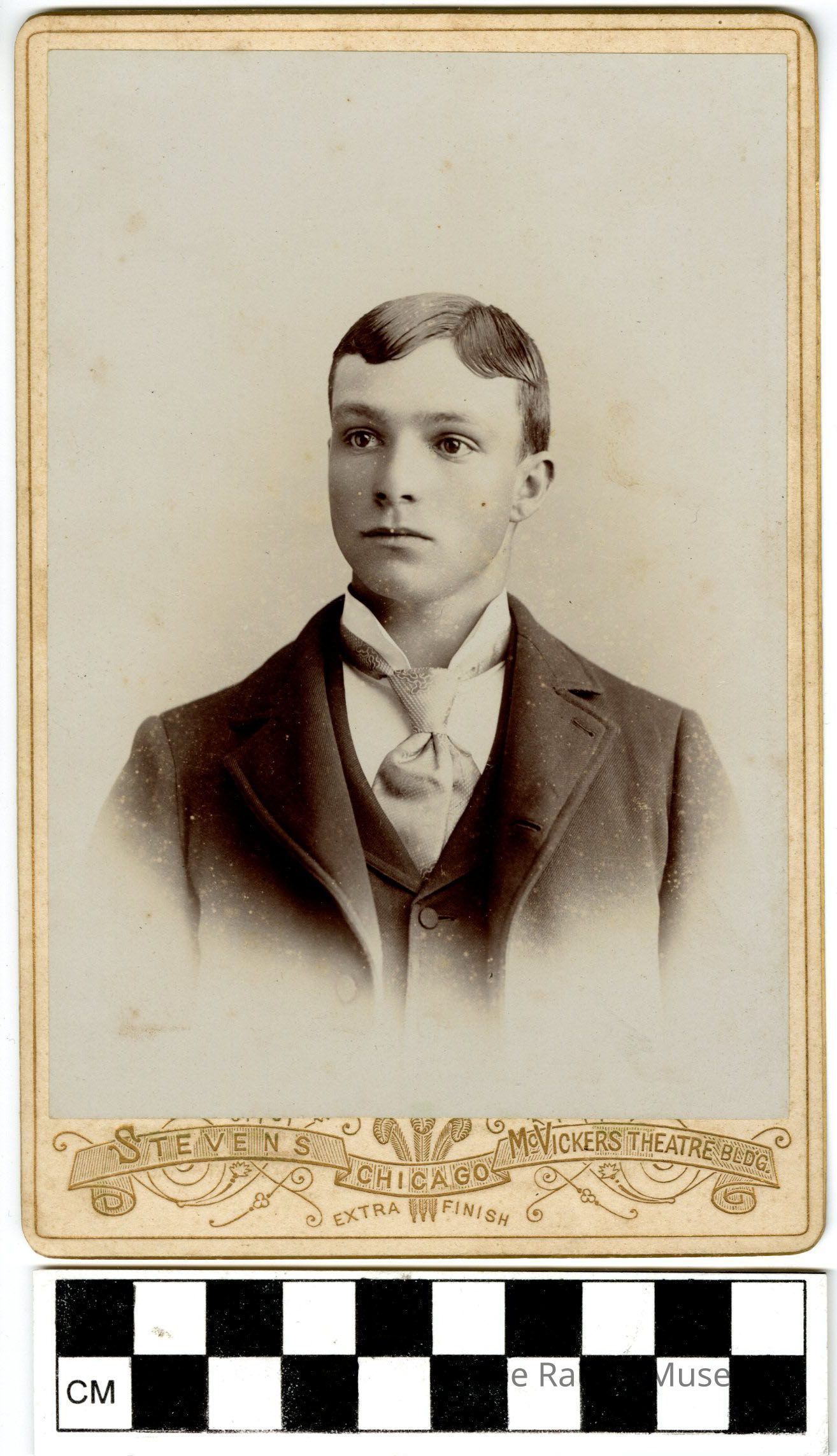 On the back is printed a decorative ribbon and flower design with the text: "Children's Pictures A Specialty, J. K. Stevens and Son Co. Portraits, McVicker's Theatre Building, Chicago, Duplicates can be had at any time." Handwritten is: "Frank Raupp Uncle, Quirine Weidner".Dimensions