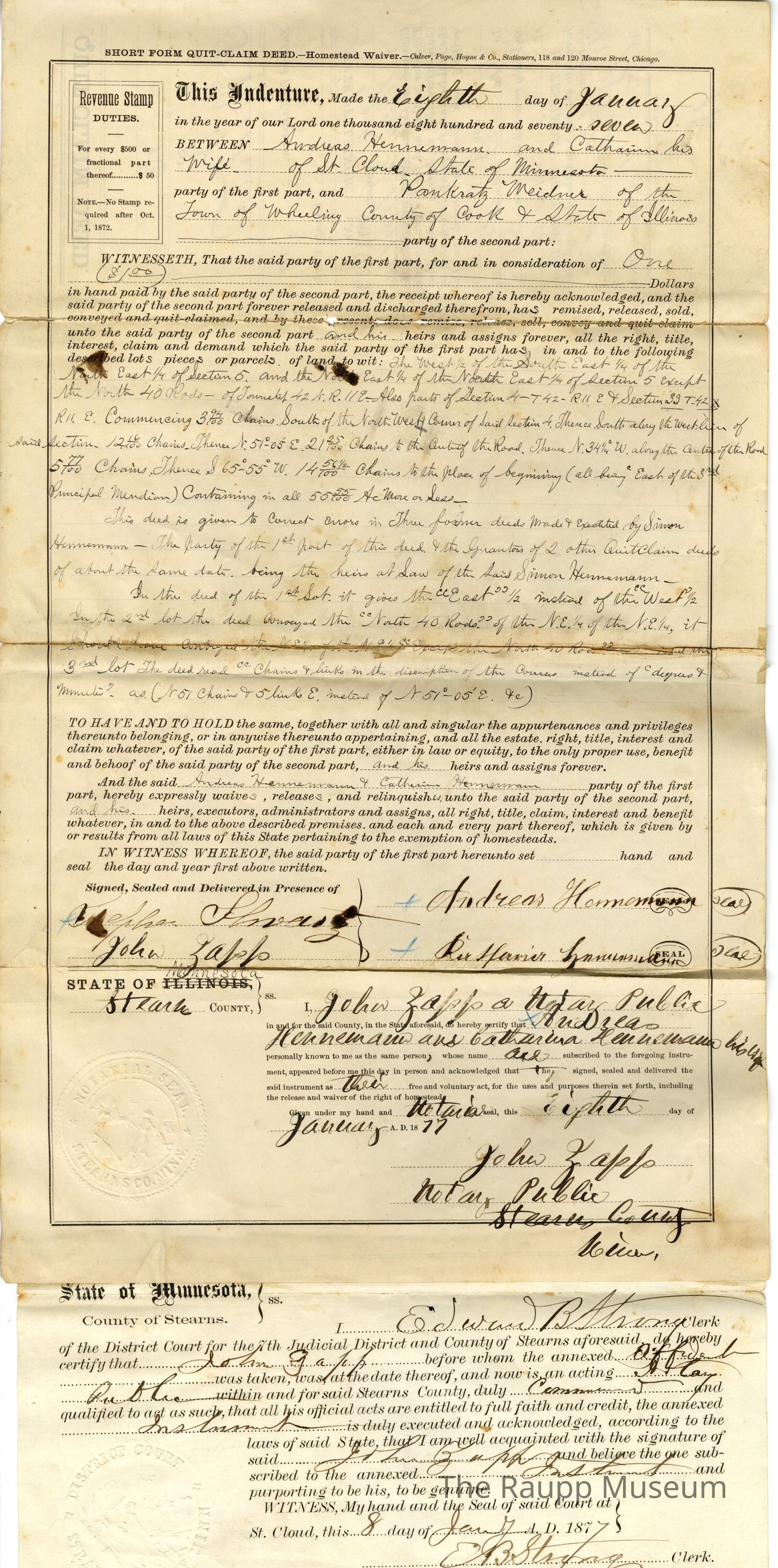 One (1) page, double-sided, Quit Claim Deed between Andreas and Catharine Henneman quit claim to land owned by Pankratz Weidner, 01/08/1877. Page has pre-printed and handwritten text, majority handwritten to describe the land in the agreement. Payment for quit claim is $100. Form is for Illinois, but Illinois at the bottom has been crossed out and Minnesota written. There is a notary seal in the bottom left. The main deed has another piece of paper glued to the bottom, of the District Court/ Clerk statement.