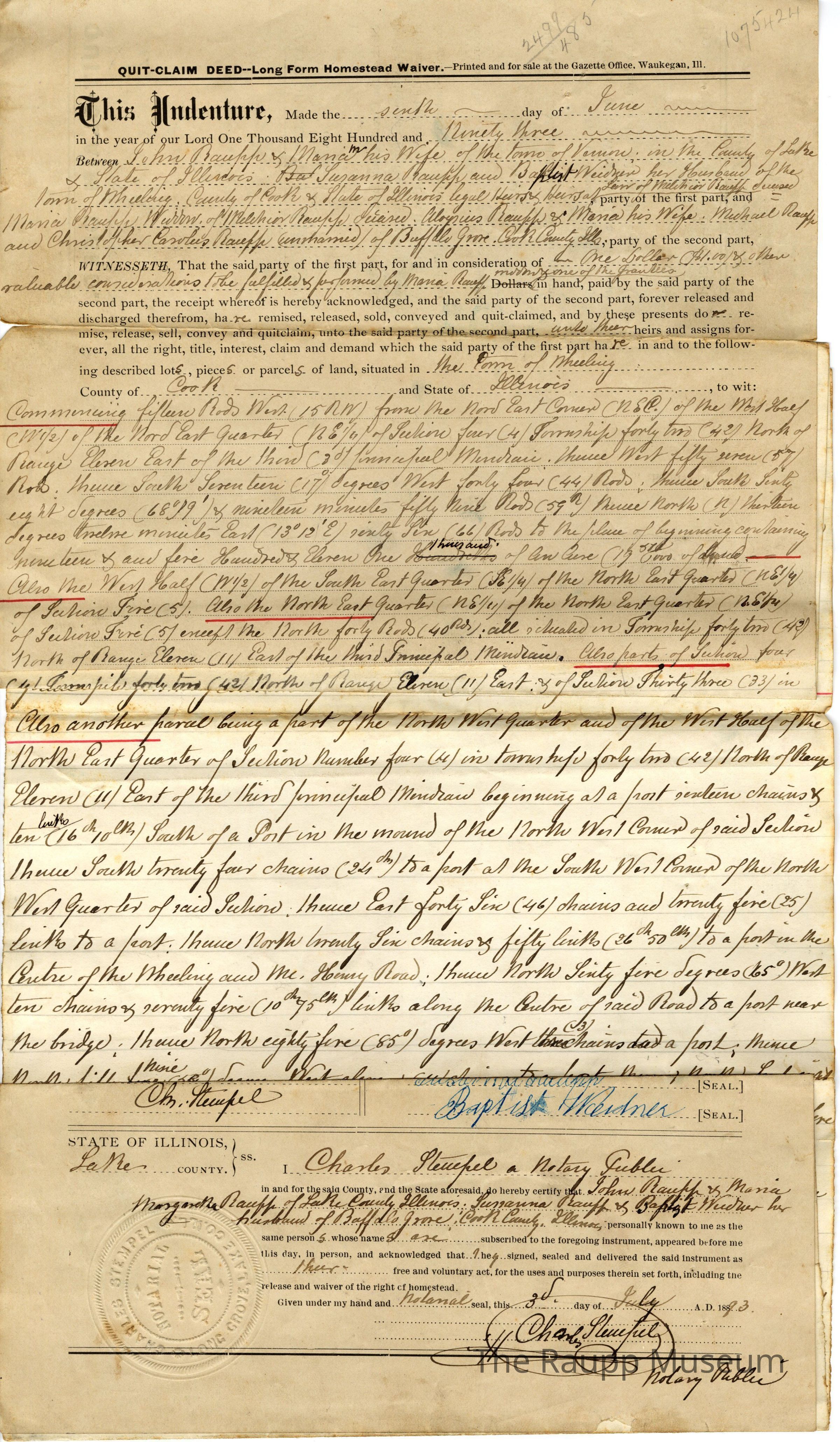 One (1) page, double sided, Quit claim deed - John Raupp et al. quit claim to land owned by Maria Raupp et al., 06/06/1893. This document is folded multiple times and has been cut and another page inserted into the center to fit all the descriptive text of the land. The beginning and end of the document has pre-printed text and then handwritten text in between in black ink, with a large page added in the center. The top and bottom pages are darker (due to age?). There is some pink lines throughout. There is an embossed notary seal on the bottom left, along with multiple signatures. There are seven creases horizontally.