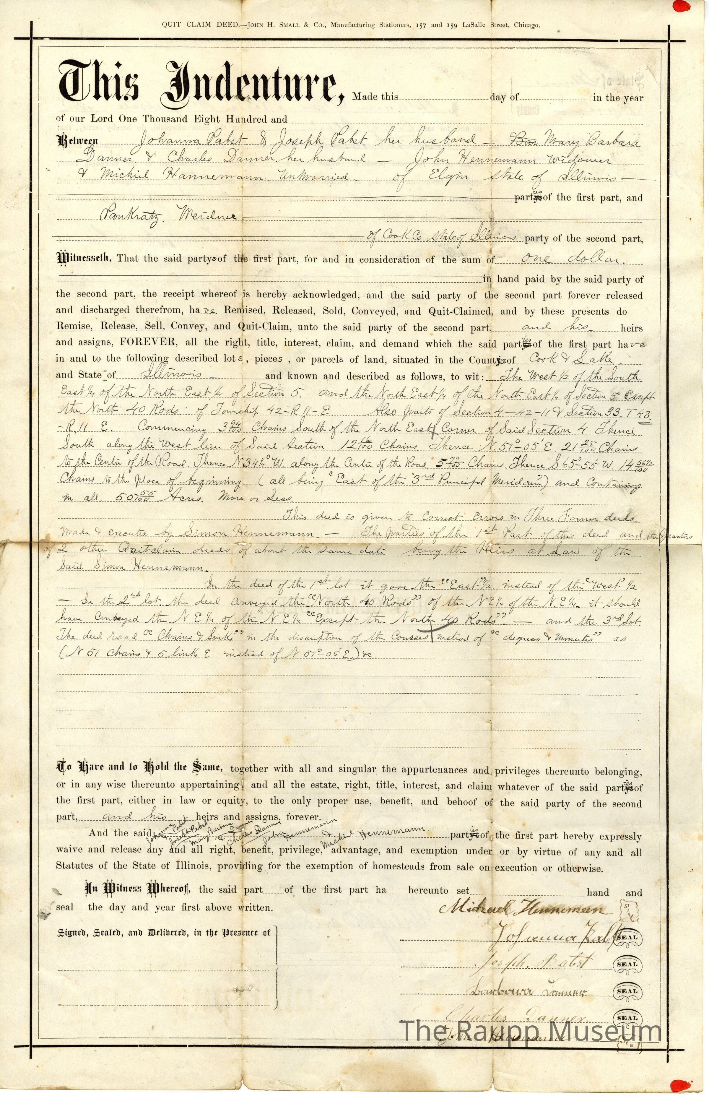 One (1) page, double sided, Quit Claim Deed between Johanna Pabst, Joseph Pabst, etc. quit claim to land owned by Pankratz Weidner, dated 08/24/1876. Deed is a mixture of pre-printed text and handwritten text in ink, to fill in blank information. Deed is signed by parties involved and 6 witnesses on the bottom. There is a red dot on the top and bottom right. The other side has a small section summarizing the document (is cover when folded) and the other half has the notary statement, signed by the Police Magistrate.