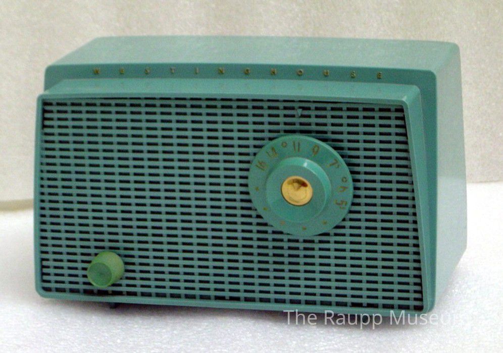 Rectangular teal plastic radio, model H351T5. Front has teal plastic grate pattern. Small volume knob near lower left and larger tuning knob in upper right area. Embossed maker mark across upper center in gold lettering: "Westinghouse." Back panel is made of particle board. Most of the parts are removed, no cord.Made/Created