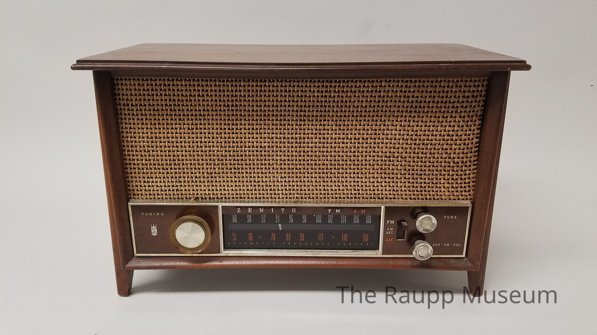 One (1) Zenith FM/AM radio. Radio has a brown grainy wood exterior with a beige reed and black metal mesh speaker front, with the plastic and metal controls on the front underneath the speaker. The bottom front has a 2.5" x 13.5" metal and plastic brown piece with three plastic and metal knobs, and a glass AM/FM scale to pick stations. On the left is "Tuning" embossed with a radio symbol embossed underneath. To the right of that is a large silver and clear knob to change the tuning. In the center is the numbers for AM (bottom in orange) and FM (top is white), with a white indicator in the center and "Zenith FM AM" embossed above the dial. On the right are two silver metal dials, one for tone (top) and off-on-vol (bottom). To the left of these dials is a brown plastic switch to move up and down for FM - FM AMC - AM.