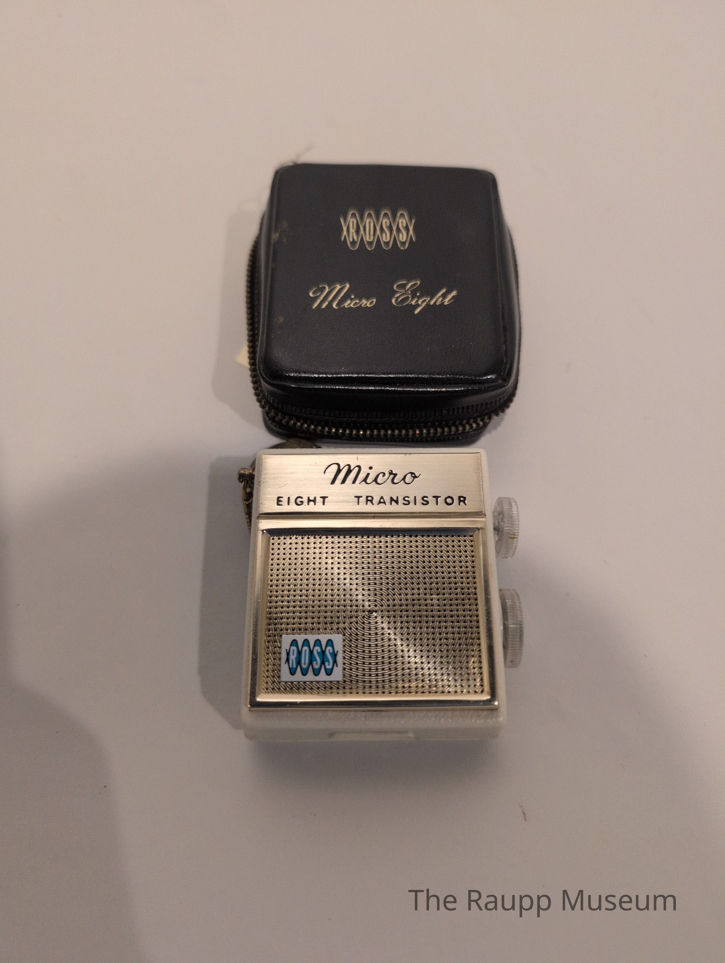 One (1) ROSS Micro Eight Transistor Radio. The radio is housed in a black leather (faux?) case that zips to close on three sides. The cover has "ROSS Micro Eight" in gold lettering, and "Hong Kong" etched into the back. The inside of the case is a silky white farbic.