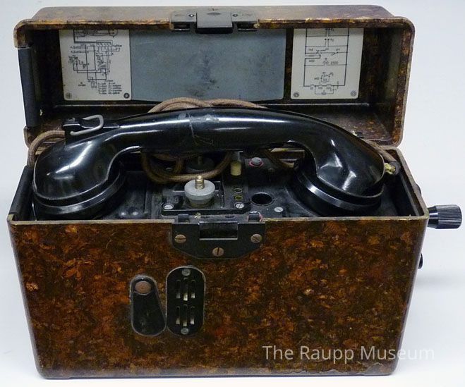 Two (2) radiophones from 1944. The radio piece, phone piece and connecting cloth wire, and instructions card are contained and attached in brown marble closable box. Engraved writing and directions are in German. Mottled Bakelite brown rectangular box with a telephone inside. Opens with removable parts (plug and handle) that attach to the box interior. Two tuners on the interior. Crank handle attached to the exterior side.Dimensions