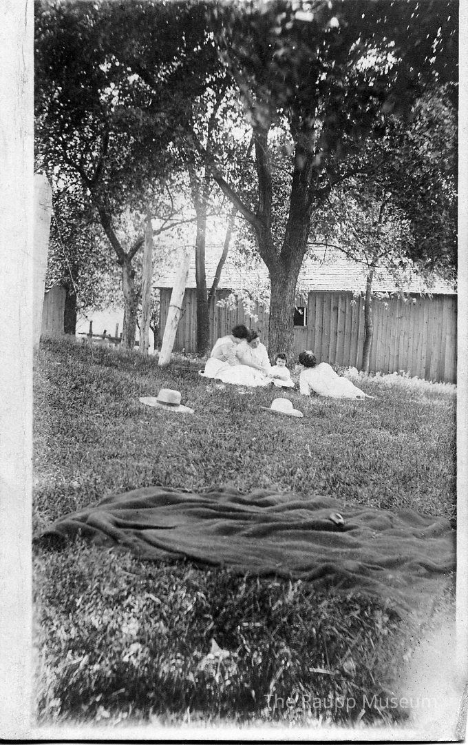 Black and white image printed on postcard with discolored white border. Image of three women seated in a circle in the grass around a child in the background in front of a wooden building. Two straw hats laying in the grass in the middle ground with a blanket in the grass in the foreground. reverse side has postcard text and handwritten ink text: "Relatives from city visiting"Dimensions