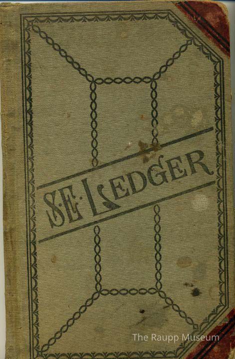 Hardbound ledger with green buckram covers and burgundy leather corners. Covers are stamped with black spiral chain pattern. Front cover stamped with "SE Ledger" marking across center. With 100 lined, numbered pages. Contains handwritten entries in black ink and pencil dated between 1928-1958. Contains Alois Raupp's personal and business financial records.