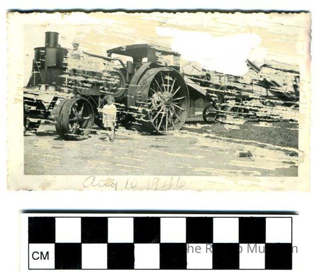 Black and white print with white border and deckled edges. Image of a man standing on a tractor and a child standing in front of it. Handwritten text on front lower border: "Aug 10 1946." reverse ink inscriptions: "Ronald Bradley Avery gas-powered tractor; Donnie Raupp Dorothy Raupp Schiller at Raupp Bros. Farm Aug. 10, 1946."Dimensions