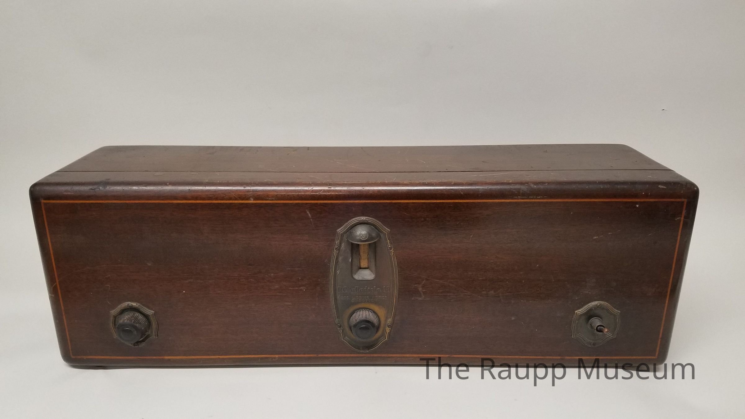 One (1) brown wood RCA-Radiola 18 radio receiver. Radio is made of dark brown wood, in a long rectangular shape. On the front is a metal plate with a black dial that turns a numbered strip up and down to play a radio signal. The name of the radio is embossed on the front: "RCA-Radiola 18, Reg. US. Pat. Off., See License Notice on Bottom". The metal plate is an oval shape with a small oval piece that sticks outward at the top, like an umbrella. Four screws affix the plate. On the right corner of the front is a metal plate with a knob in the center that can be moved left and right. On the left front bottom corner is another round knob.