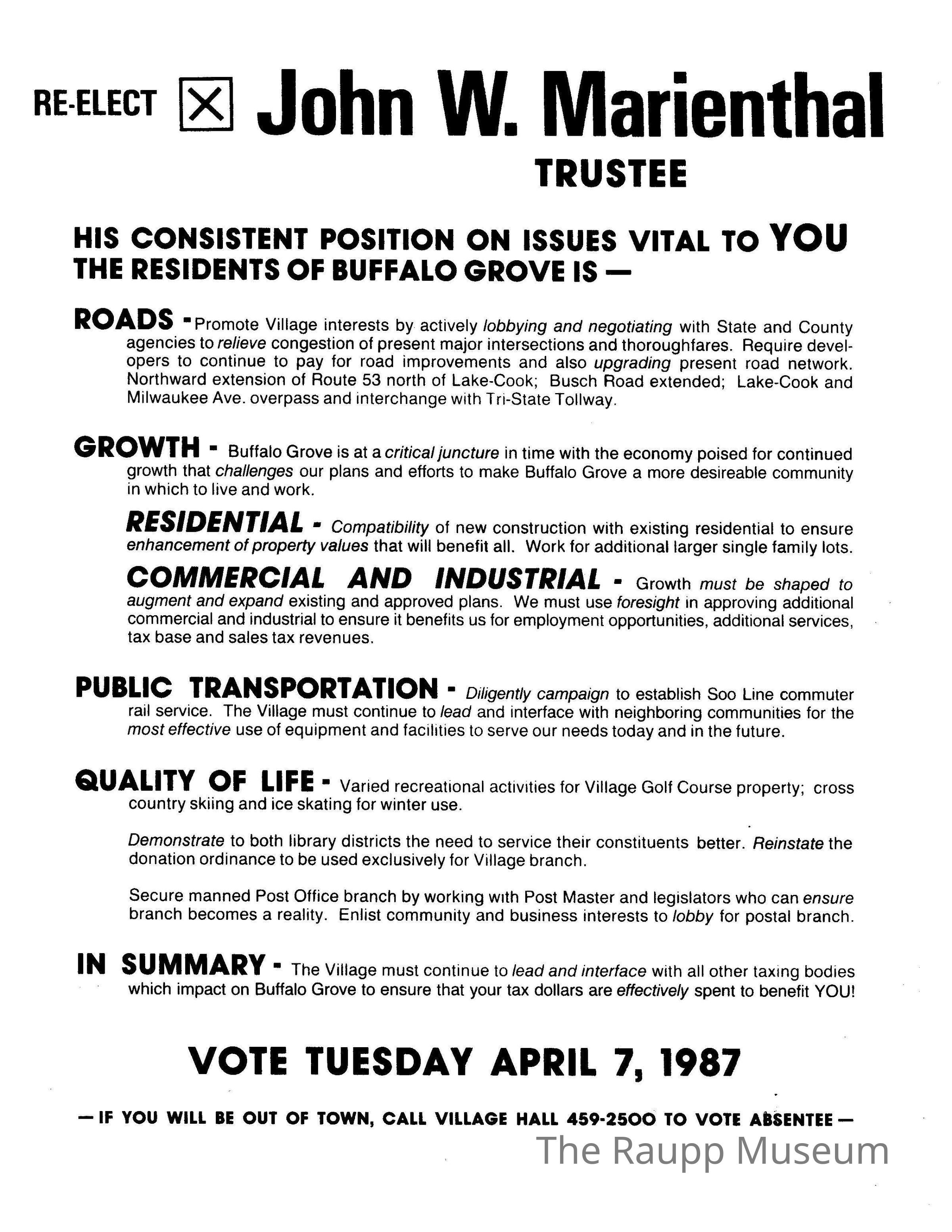 One (1) double sided pamphlet for John W. Marienthal Village Trustee re-election.