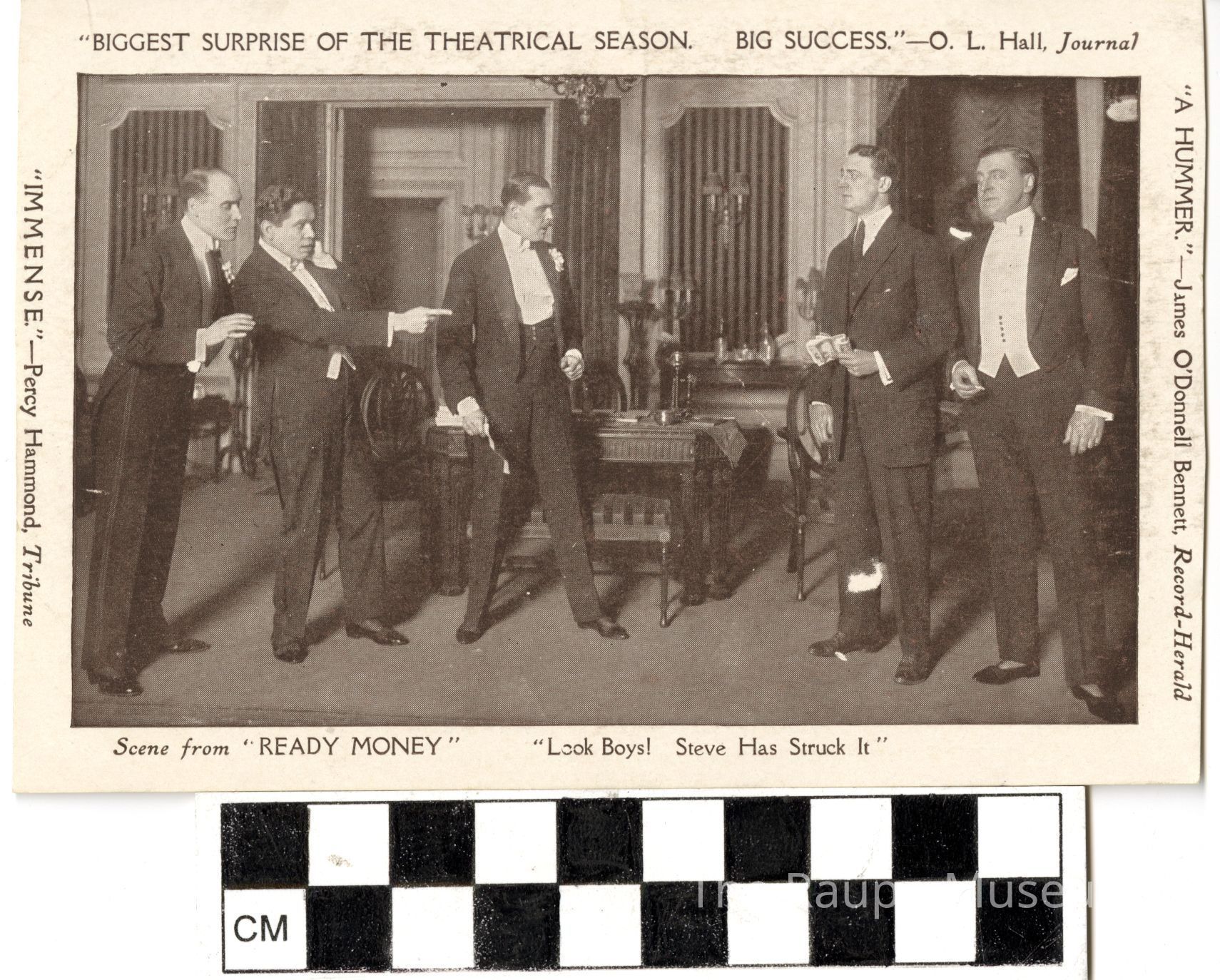 One (1) beige, black, and white paper postcard advertisement for the play "Ready Money". The front has a black and white photo of 5 men dressed in black suits with white undershirts. Two men are on the right, the one on the inside holding a wad of cash. Three men are opposite them on the left side. The middle man is pointing at the two men and the other two men on either side are looking down at the money where he is pointing. They are in a living room, with chairs and table, decorative curtains behind, and lamps on the walls. Along the edges of the picture is printed reviews: "Biggest Surprise of the theatrical season. Big Success - O/L/ Hall, Journal; Immense - Percy Hammond, Tribune; A Hummer - James O'Donnell Bennett, Record-Herald". and "scene from "READY MONEY", "Look Boys! Steve Has Struck It" - captioning the photo.